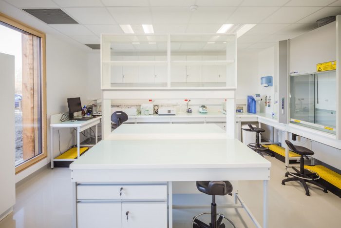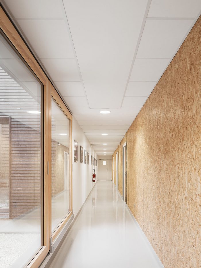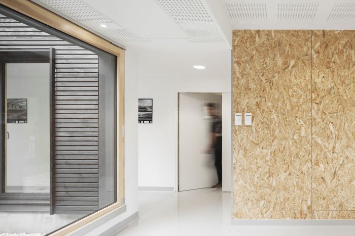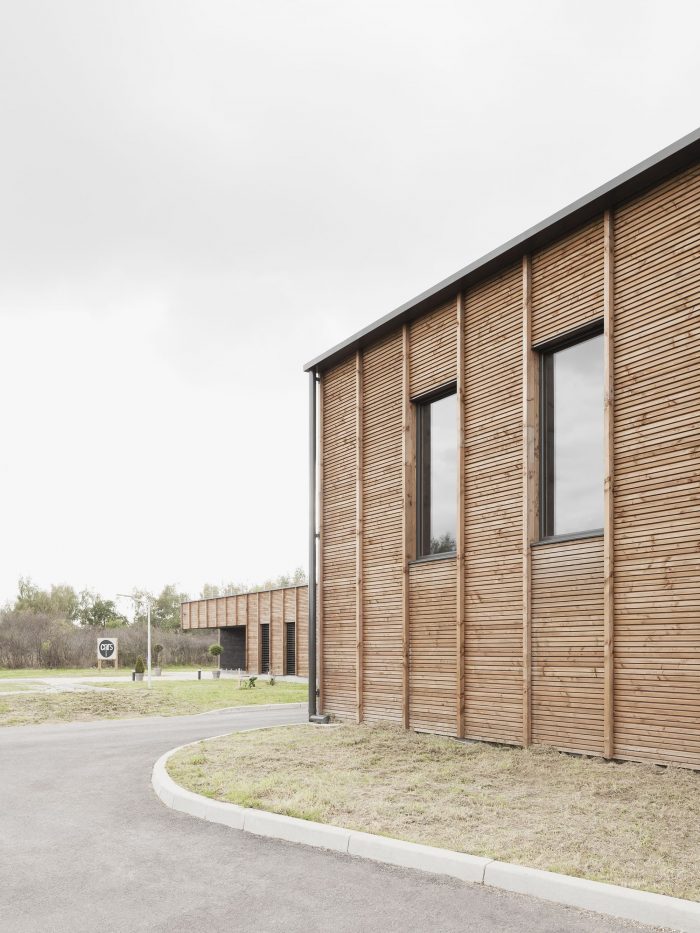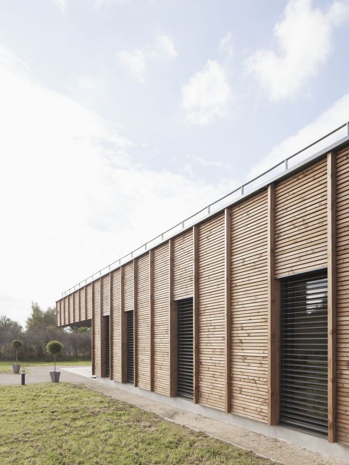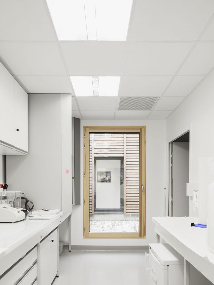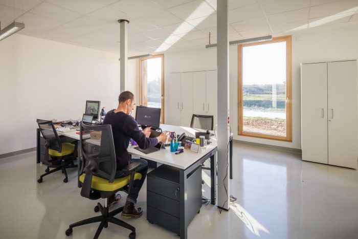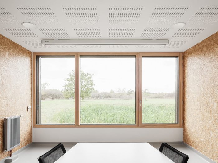 In this natural environment far from the bustle of the city, optimum use is made of wood. This material minimizes the building’s ecological footprint and enhances its blending into its surroundings. The architectural statement primarily tends towards sobriety in the use of materials and energy without resorting to a forced, complex demonstration of this rationale. It is a “low tech” building serving research, sober and minimalist in its statement, open and generous in its layout, spatial organization, and luminosity.