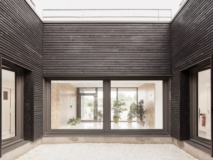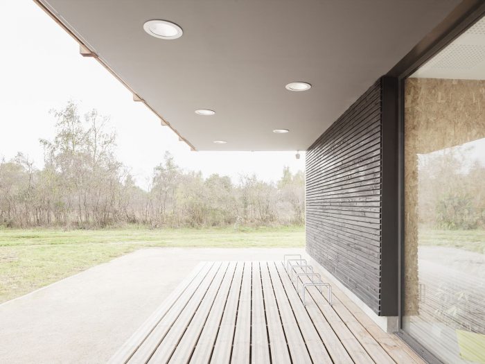 They provide solar protection and are used to conceal the interior. A simple recess in the volume and dark cladding indicate the bicycle parking area and the glazed frontage marks the entrance to the building protected by a simple porch. A wood-burning boiler provides hot water and heating.