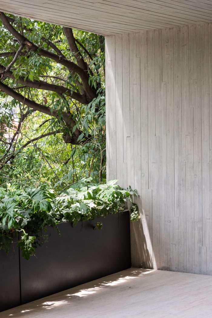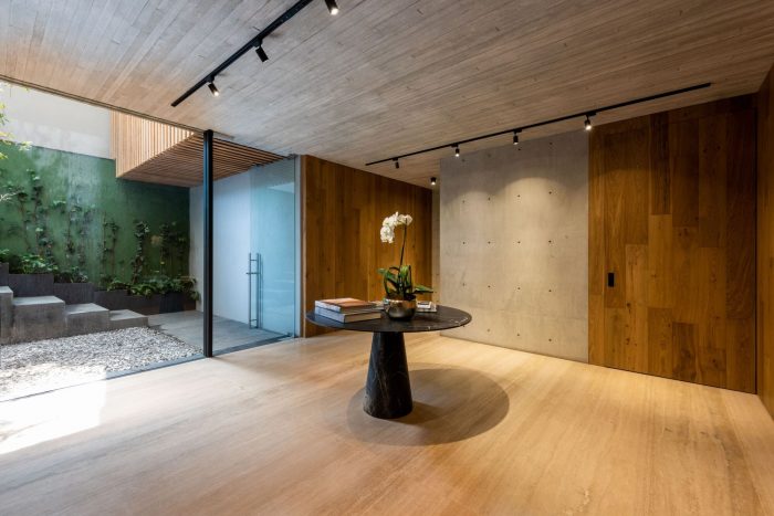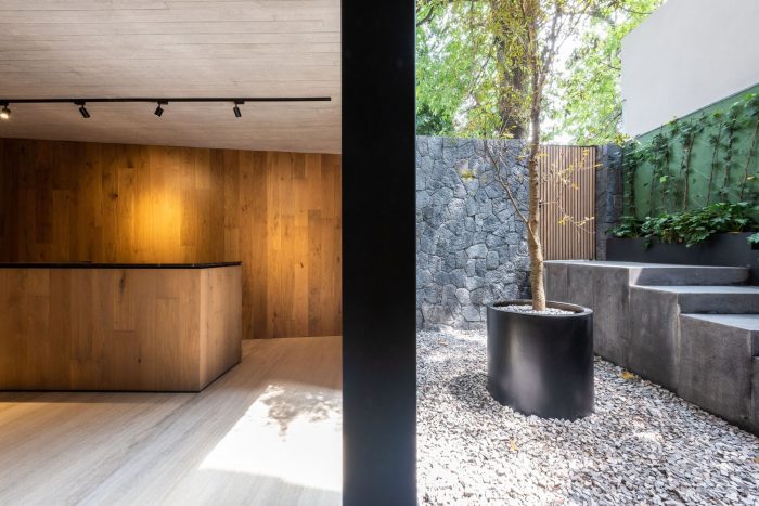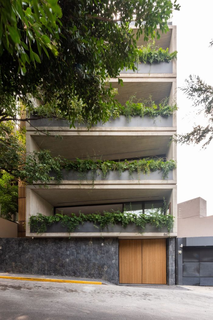 AN 867 is a vertical development located in the State of Mexico in a residential area to the west of Mexico City. The project seeks to adapt to the environment with the use of sober materials such as concrete and natural pine wood. The building is located on a 268m2 area of land and has 4 levels of apartments and two basements for parking. The building has an access patio that is at a lower level than the street, through which there is access to a lobby that connects with both parking levels. This is a sculptural space with vegetation that invites the user to access the building.