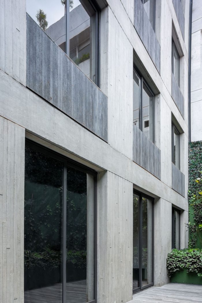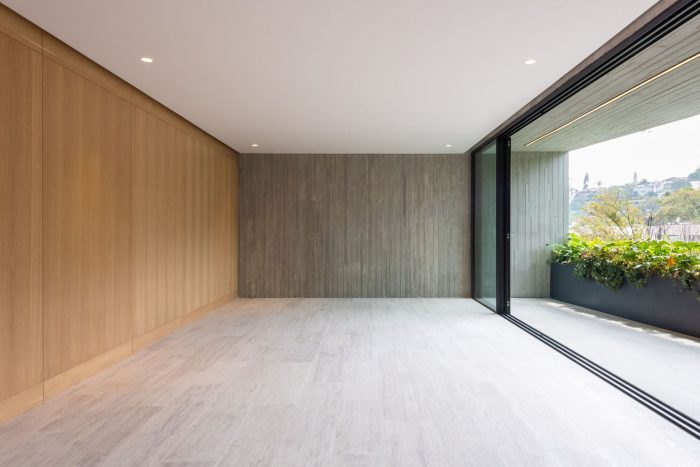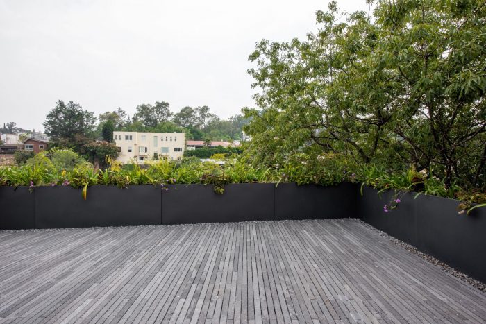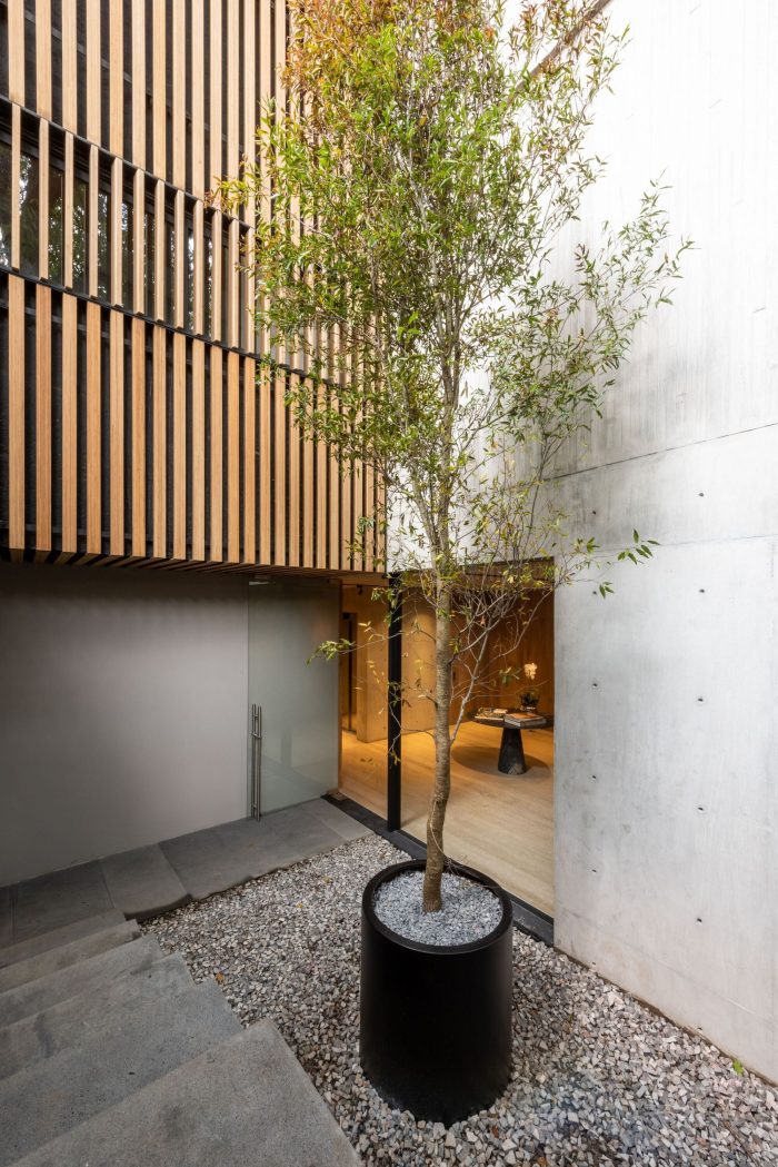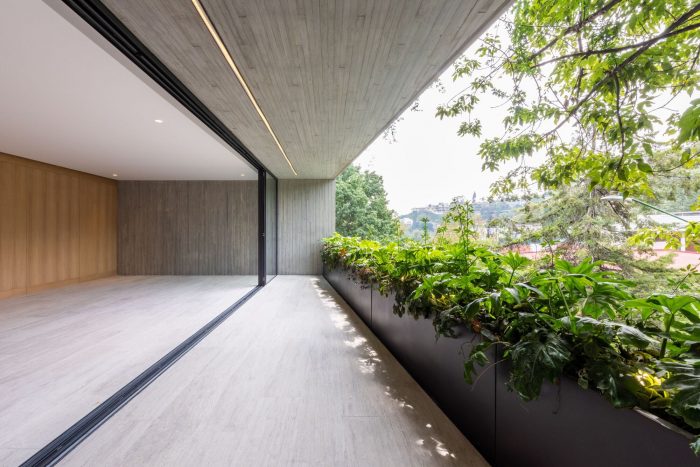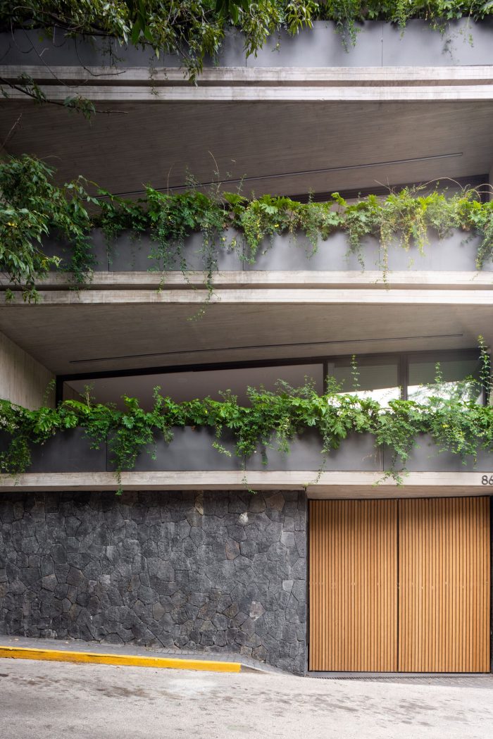 This development has one house per level, offering total privacy between neighbors. The entrance to each apartment is through an elevator that opens directly to the public area. In this space there is a terrace that connects directly with the outdoor space which allows the entry of light and a relation with the existing vegetation of the place to be constant. The private area of each apartment is located at the back of the building allowing the privacy of its inhabitants. On the upper level there is a private roof garden for the pent house and a public one, both surrounded by vegetation and views of the city. The main facade is made up of concrete frames that simulate being stacked on top of the other and finally laying on a natural stone wall. These blocks have a continuity in the concrete finish that surrounds the entire block. This space corresponds to the public space of each residence. In a subsequent plane, there is the facade of the kitchen area with a natural wood latticework that has a system that allows the it to open, letting natural light into the space, and at the same time provide privacy within it. It was sought to use materials in their natural state that age together with the building and that allow it to continue adapting to the environment over time.