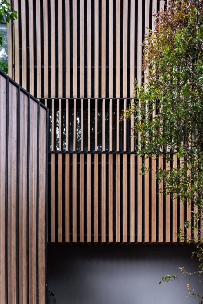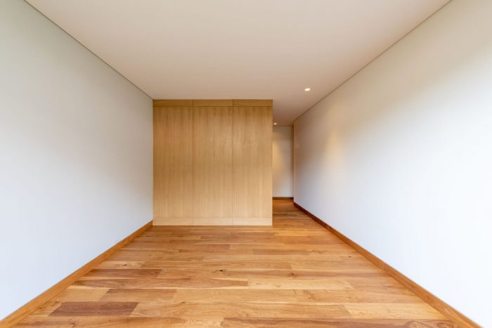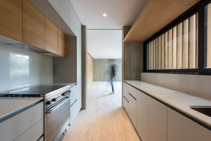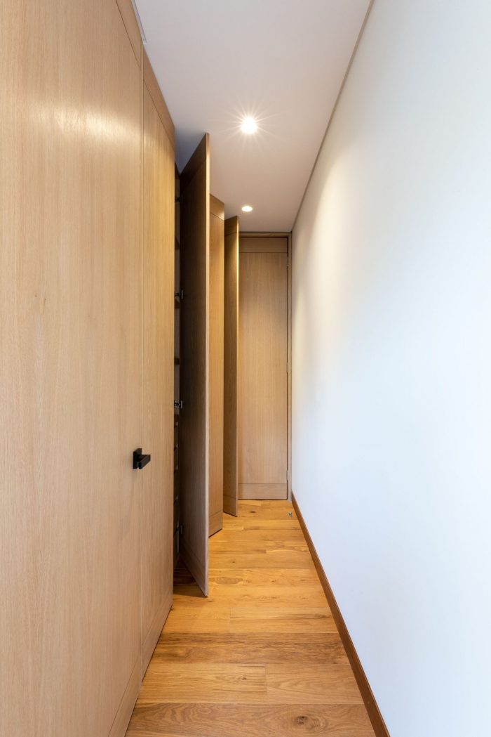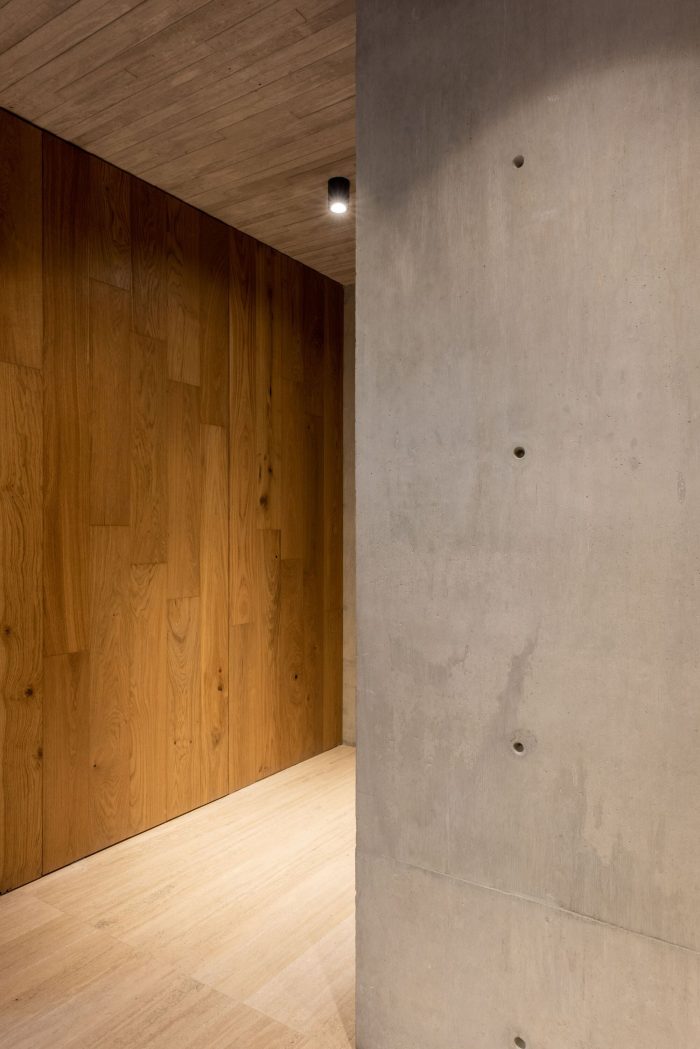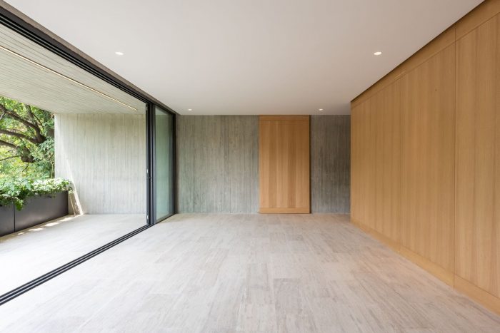 This development has one house per level, offering total privacy between neighbors. The entrance to each apartment is through an elevator that opens directly to the public area. In this space there is a terrace that connects directly with the outdoor space which allows the entry of light and a relation with the existing vegetation of the place to be constant. The private area of each apartment is located at the back of the building allowing the privacy of its inhabitants. On the upper level there is a private roof garden for the pent house and a public one, both surrounded by vegetation and views of the city. The main facade is made up of concrete frames that simulate being stacked on top of the other and finally laying on a natural stone wall. These blocks have a continuity in the concrete finish that surrounds the entire block. This space corresponds to the public space of each residence. In a subsequent plane, there is the facade of the kitchen area with a natural wood latticework that has a system that allows the it to open, letting natural light into the space, and at the same time provide privacy within it. It was sought to use materials in their natural state that age together with the building and that allow it to continue adapting to the environment over time.