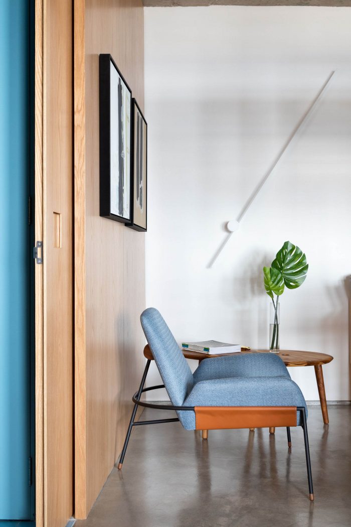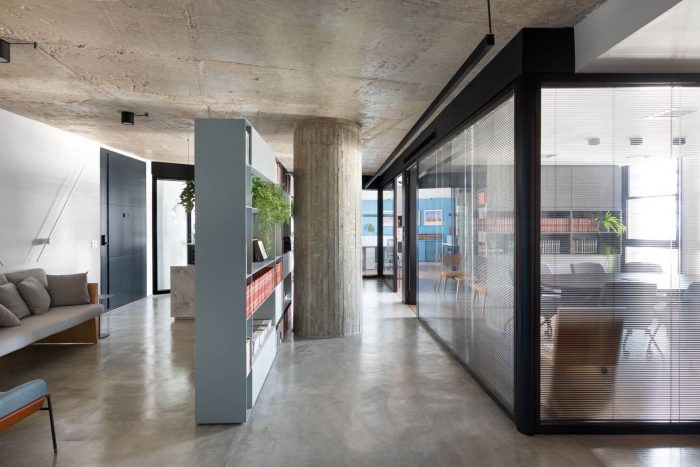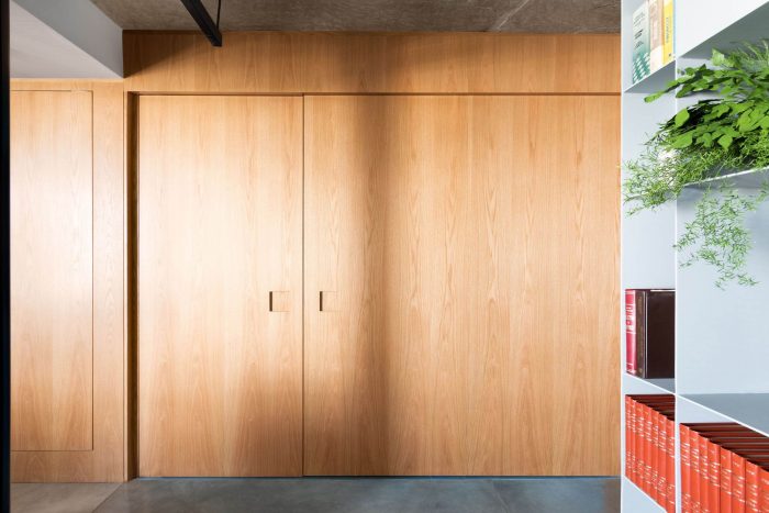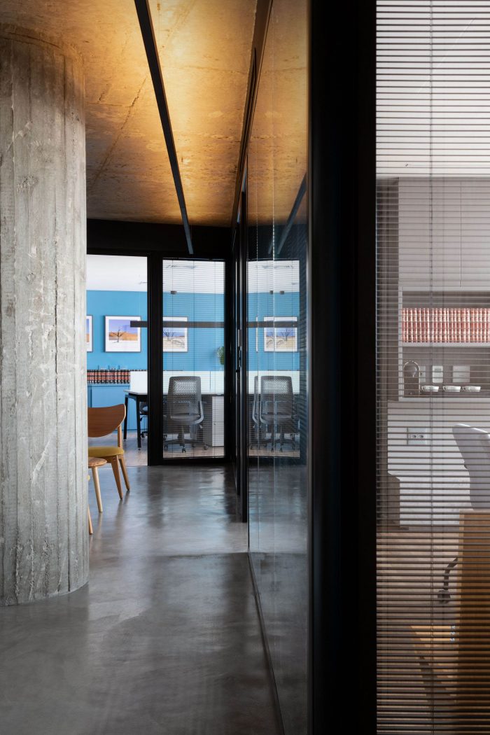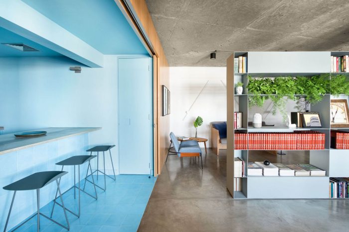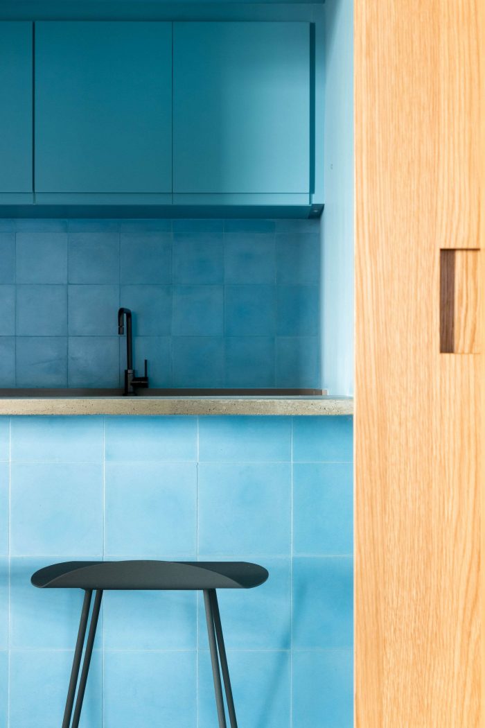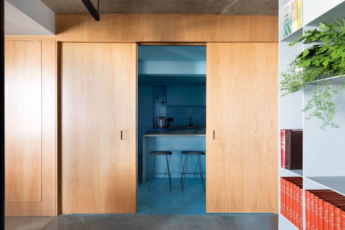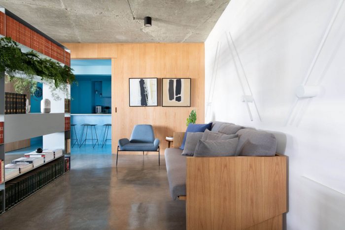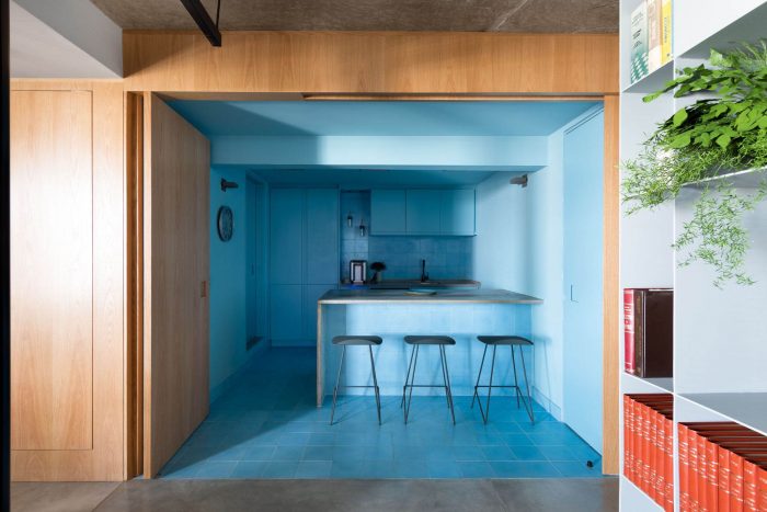 The choice of leaving the two circular pillars and the reception's ceiling in exposed concrete, refers to a desire to highlight the structure of this unique building. The hydraulic tiles used in the pantry and the restrooms mirror a contemporary look without losing the essence of this material. The pantry is placed as a celebrative space for the office team, where they can have moments of decompression during the routine, as well as serving as a support for company meetings. The intention of making it all in the blue color because of the company's identity, has also the intention of establishing a compositional unity of the space, creating a large monoblock. This monoblock opens and closes completely by means of wood panels, bringing irreverence and personality to the space, besides being suitable for different uses.