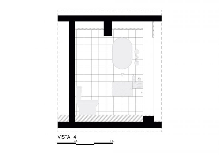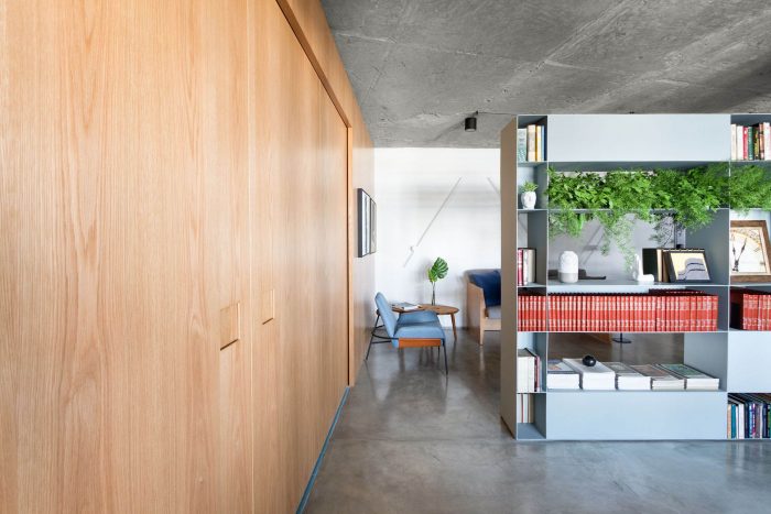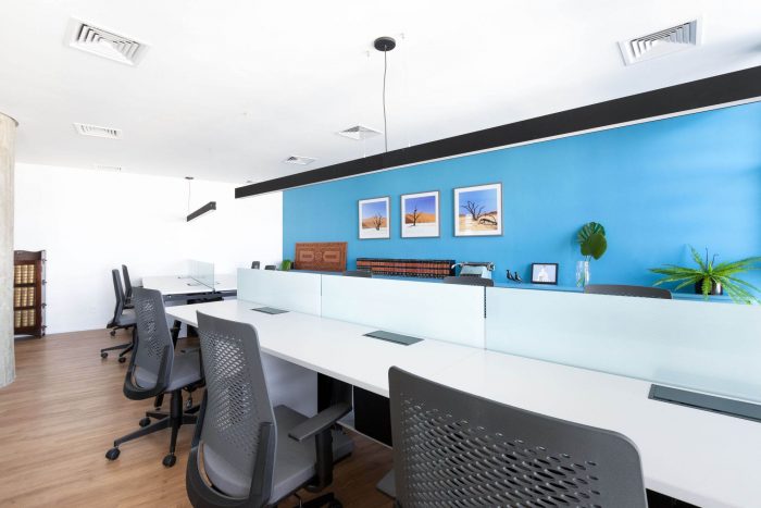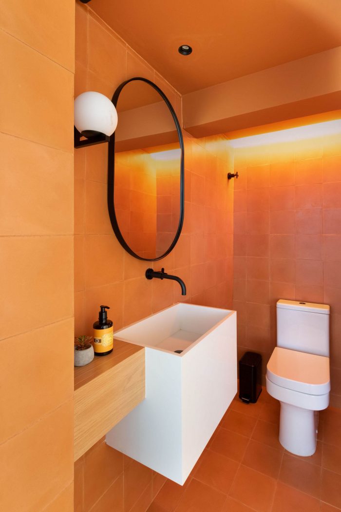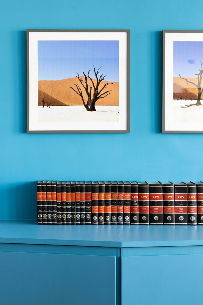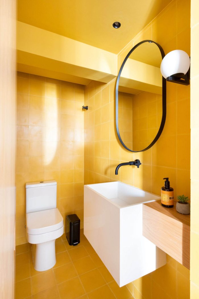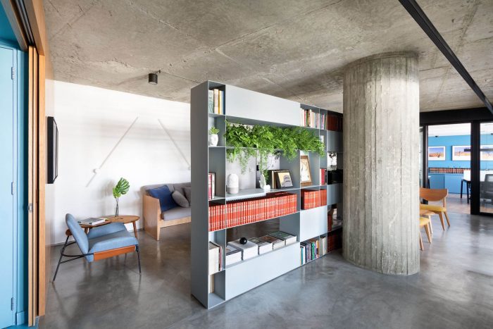 The choice of leaving the two circular pillars and the reception's ceiling in exposed concrete, refers to a desire to highlight the structure of this unique building. The hydraulic tiles used in the pantry and the restrooms mirror a contemporary look without losing the essence of this material. The pantry is placed as a celebrative space for the office team, where they can have moments of decompression during the routine, as well as serving as a support for company meetings. The intention of making it all in the blue color because of the company's identity, has also the intention of establishing a compositional unity of the space, creating a large monoblock. This monoblock opens and closes completely by means of wood panels, bringing irreverence and personality to the space, besides being suitable for different uses.
