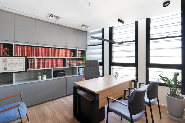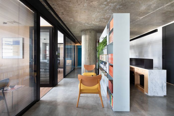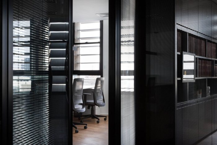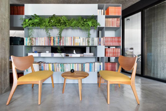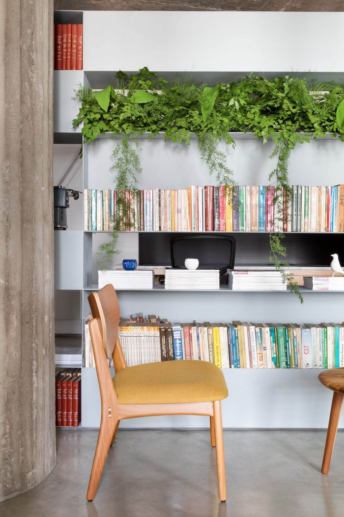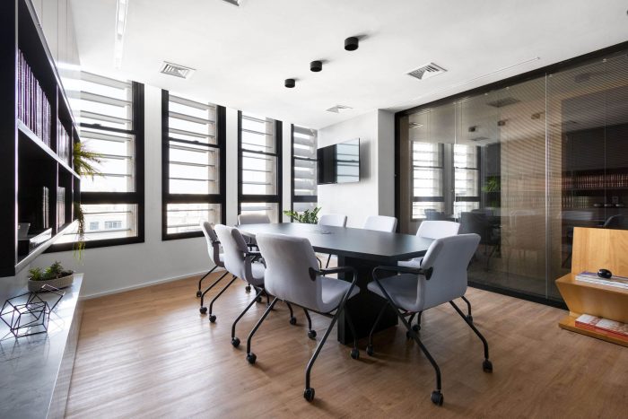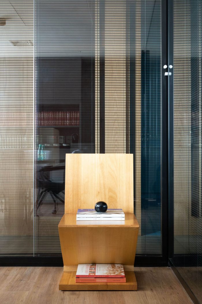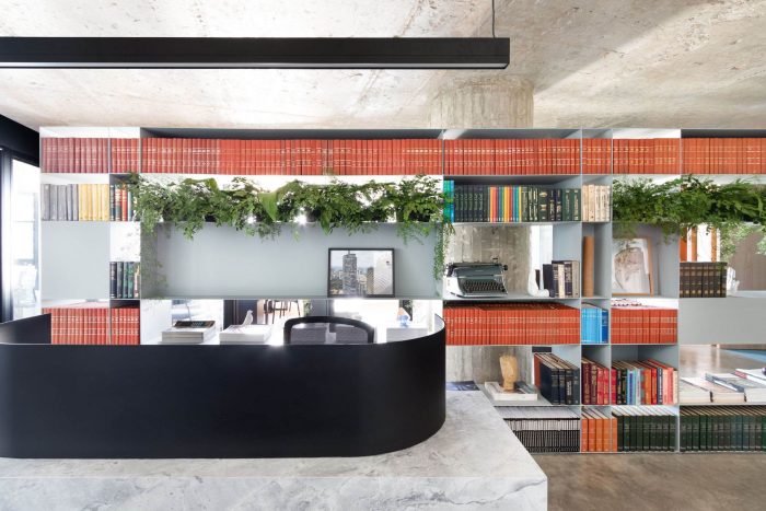 Like this environment, the restrooms also follow this compositional unity, bringing more colors to the project's palette and allowing a relaxation before the whole. In the reception area, the extensive bookcase made of locksmith creates a protagonism in the project, because it defines a demarcation line that allows the separation of the spaces in a light and uncluttered way, storing the client's book collection. The other environments (board of directors, meetings, and office), which are designed around it, are spaces of constant interaction with natural lighting, and can be seen through the transparency of the partitions. In addition, in the office, a curved wall was created, seen from the entrance and the reception area, reminding the shape of the building itself.