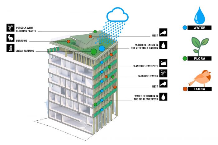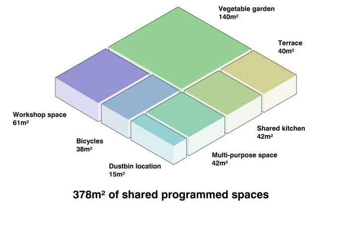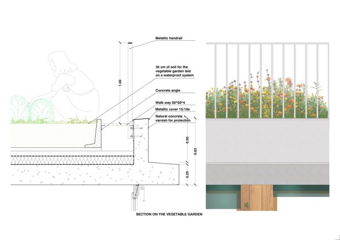 These plants have had time to establish themselves and grow before the arrival of residents. Residents are thereby greeted by an established natural environment, for which they will have responsibility. The project thus proposes a sort of ‘permacultural’ way of life: residents will produce some of their own food, learning the pleasure of watching food grow, a means of encouraging them to participate in the collective effort that we must all undertake to reduce supply chains and move towards a landscape of edible permaculture as near as possible to home.