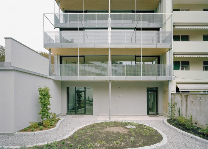 Above a metalwork shop in Basel’s Matthäusquartier, eight new residential units rise. Made from prefabricated wood elements, the new four-story building sits atop the existing ground-level structure. On the street side, the addition matches the eave height of the neighboring property and reinterprets the adjacent roof edge as a sawtooth roof. Its shape and orientation also make it the ideal location for the building’s solar panels. On the courtyard side, the building is stepped back as required by zoning, creating a spacious balcony for each apartment.