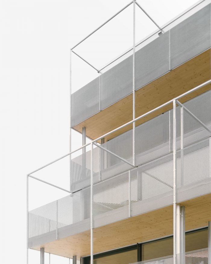 Large metal panels protect the wood structure from the elements and add urban flair. The construction firm that runs the metal shop on the ground floor was extensively involved in the project – they fabricated the street-facing facade, among many other components – and their materials are visible everywhere. The simplicity of the fabrication and construction processes remains visible in the finished building, and the interplay between the different materials contributes significantly to the atmosphere of the space.
