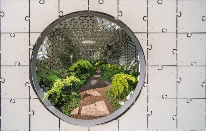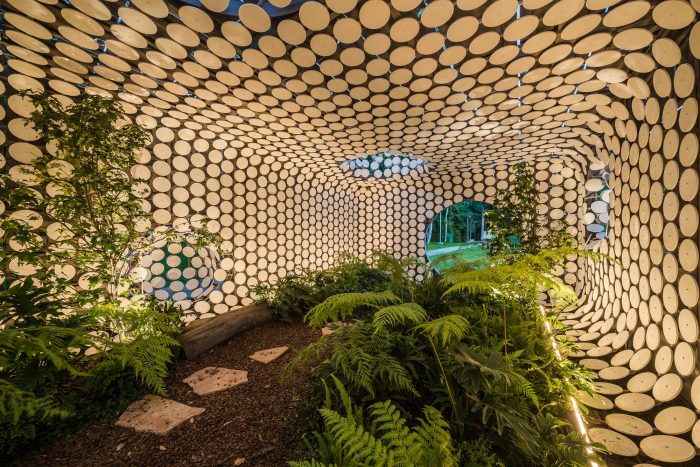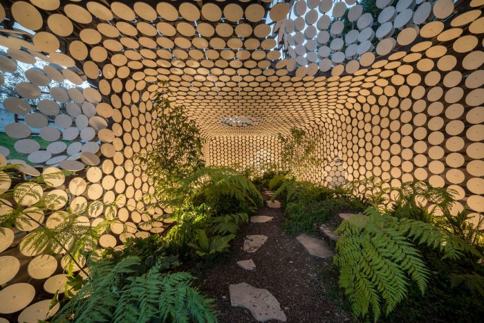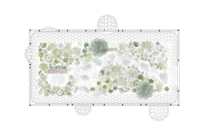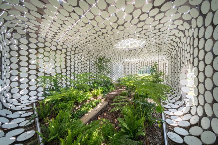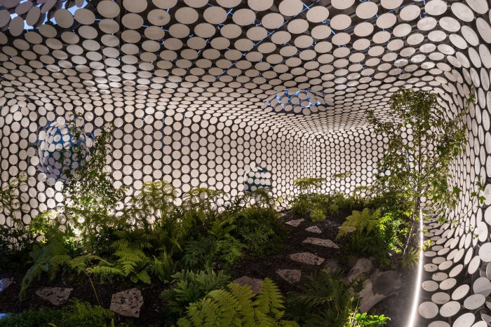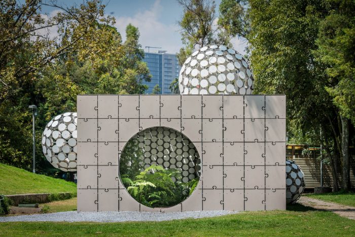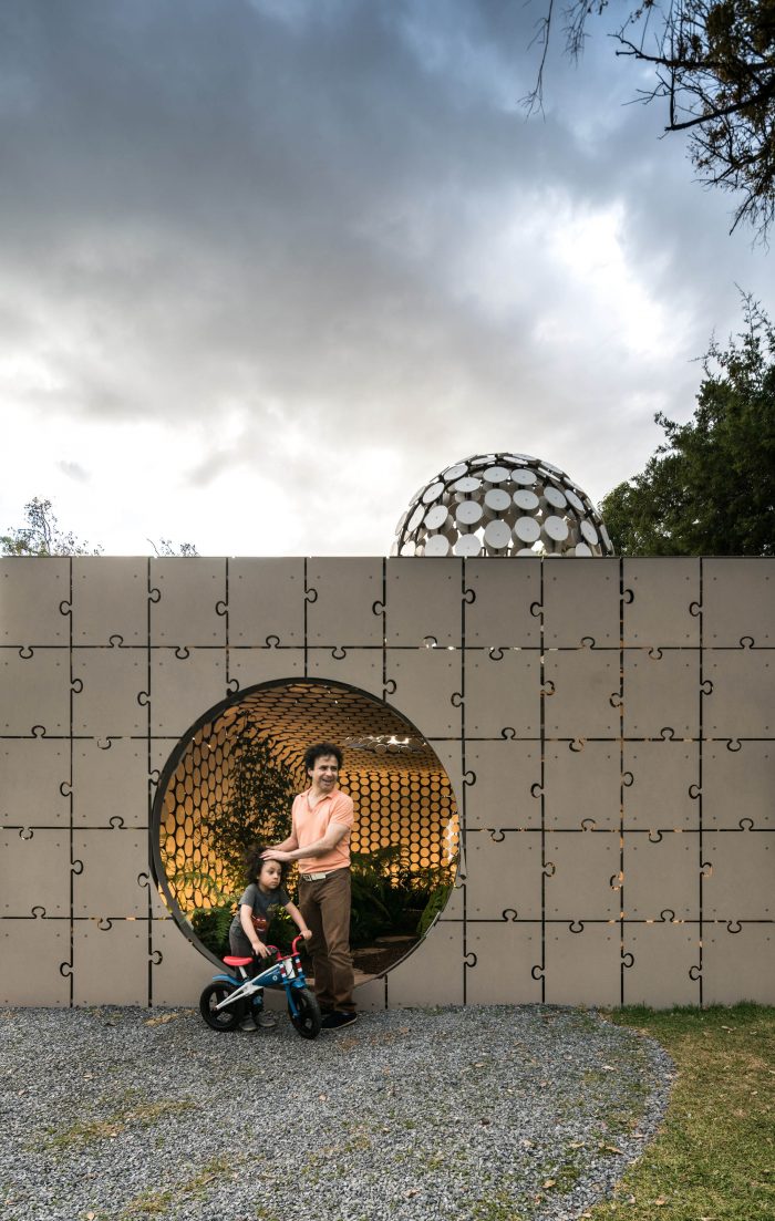 Egaligilo Pavilion is an installation and represents the tension between traditional and parametric architecture acting as an equalizer of forces between them while preserving a natural environment inside. Egaligilo means Equalizer in Esperanto, a language created to facilitate international communication. Design and architecture have to act as a change agent, as a tool for facing global challenges and generating solutions to improve the quality of life of our communities. Egaligilo attains a constant interaction with its surroundings, and as it blends in with the public space, it also holds a living oasis inside, in which symbolism is exalted and gives the visitor the capacity to connect with the natural environment. The pavilion creates its own microclimate by preserving a series of atmospheric conditions required to maintain a small cloud forest on the inside, by allowing light and rain to seep inside through both skins, keeping the plants alive. The openings between the overlapping skins and the effects of artificial lighting, create different scenarios throughout the day, inviting the spectator to enter the pavilion redefining the narrow limit between inside and outside.