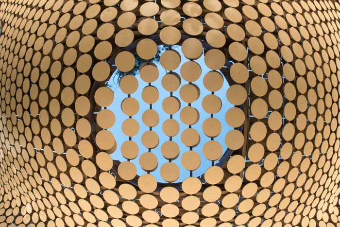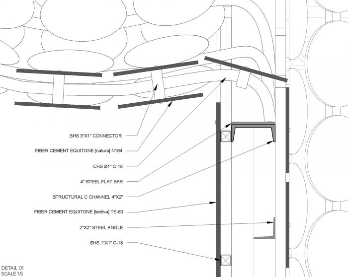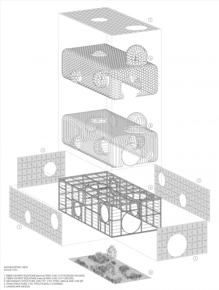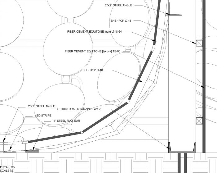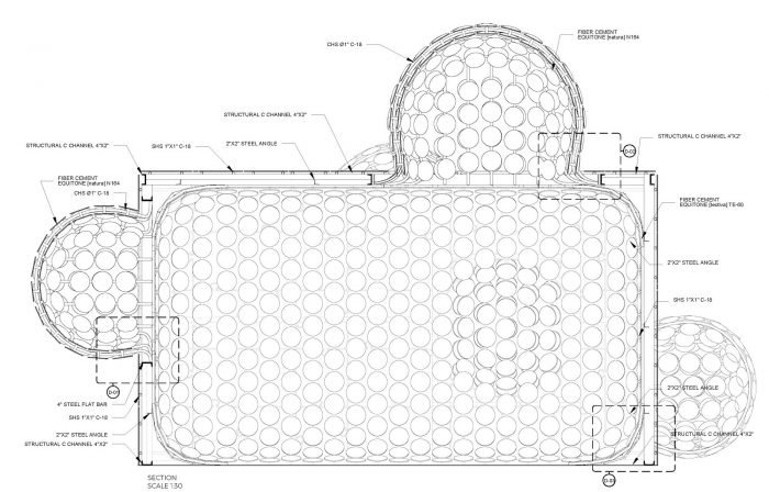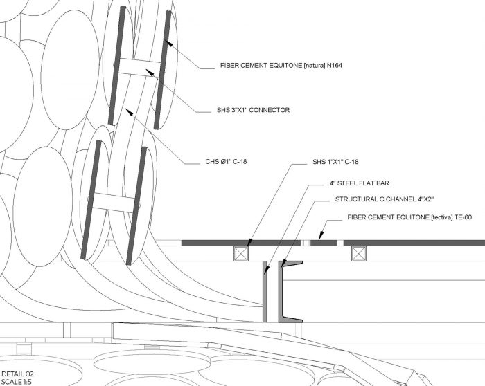 The Pavilion’s skins were made with Equitone, fiber-concrete material water, and weather-resistant; “Tectiva” and “Natura” were the selected panels we used. These panels were cut by a CNC router to fit the proposed design. 400 patterned puzzle pieces were cut for the outer skin and more than 3,000 circles for the inside volume. The main structure was made of steel C channels 4” by 2” and 2” by 2” steel angles, the secondary structure that supports the inner skin was made of SHS 1” by 1” C-18, and the structure of the “bubbles” were made of CHS of 1” rolled with the specs provided to the blacksmith welded to a 4” steel flat bar.
