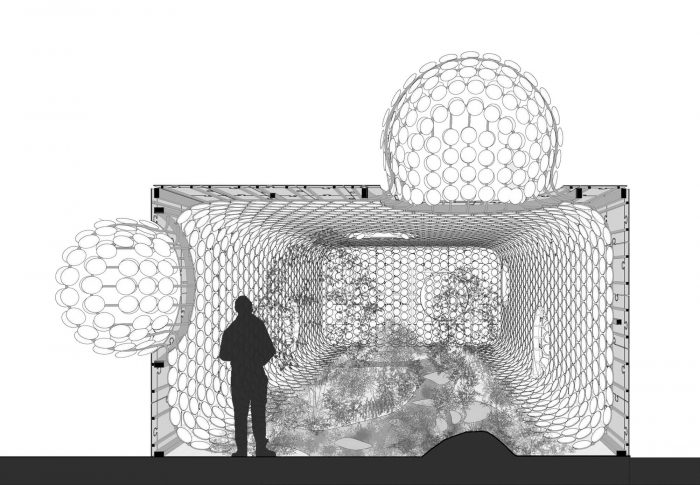Egaligilo馆是一个装置,代表了传统建筑和参数化建筑之间的张力,作为它们之间力量的平衡器,同时保留了内部的自然环境。Egaligilo在世界语中的意思是平衡器,这是一种为促进国际交流而创造的语言。设计和建筑必须作为一个变革者,作为面对全球挑战和产生解决方案的工具来改善我们社区的生活质量。Egaligilo与周围的环境实现了持续的互动,当它与公共空间融为一体时,它也在内部拥有一个生活的绿洲,其中的象征意义得到了升华,使参观者有能力与自然环境联系起来。该馆通过保留一系列维持内部小型云雾森林所需的大气条件,创造了自己的小气候,让光线和雨水通过两层皮肤渗入内部,保持植物的活力。重叠的表皮之间的开口和人工照明的效果,在一天中创造了不同的场景,邀请观众进入展馆,重新定义内部和外部之间的狭窄限制。