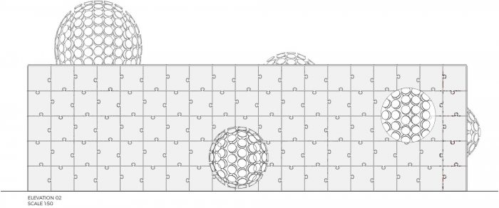 Modern architecture has remained valid through history as human understanding of functional spaces, in the pavilion, this is represented by an orthogonal geometric enclosure composed of puzzle-shaped concrete pieces, that modulates the pavilion’s dimensions and its steel structure. On the other hand, parametric architecture is represented by an organic skin formed by white concrete circles, that strive to demonstrate its aesthetic value, to break the barrier of traditional paradigm, the rationality of thought, and to create its own language through technological development.
