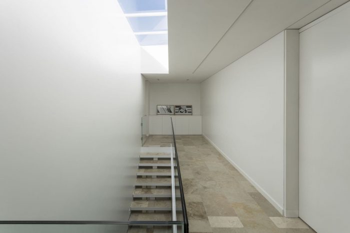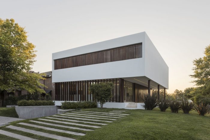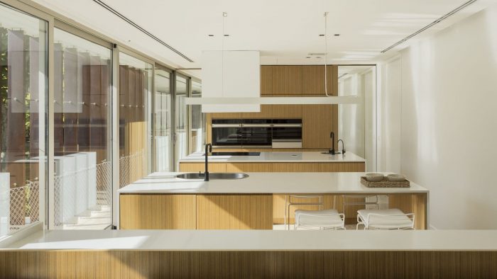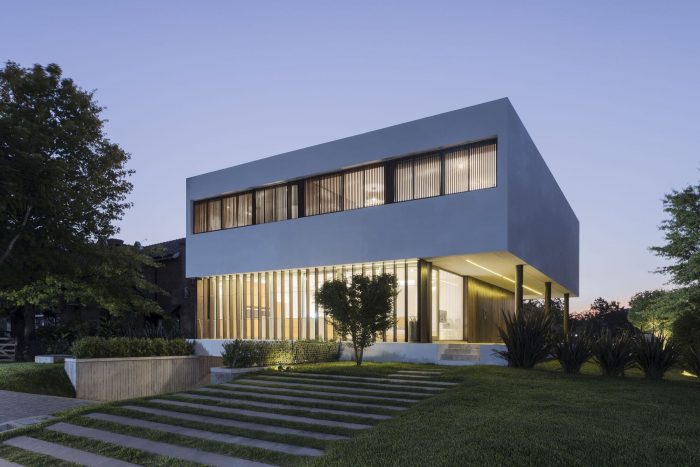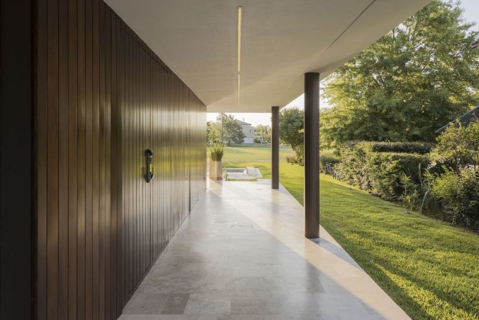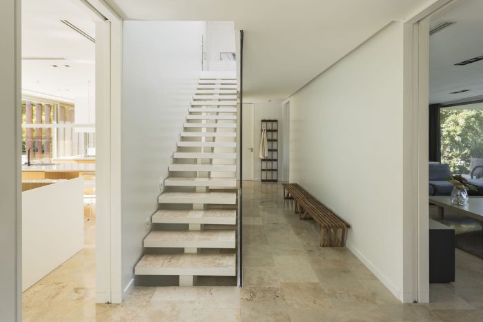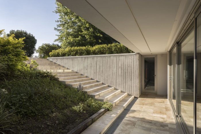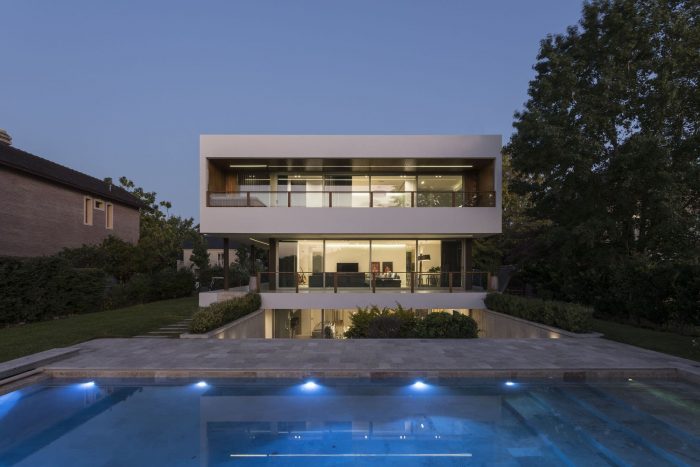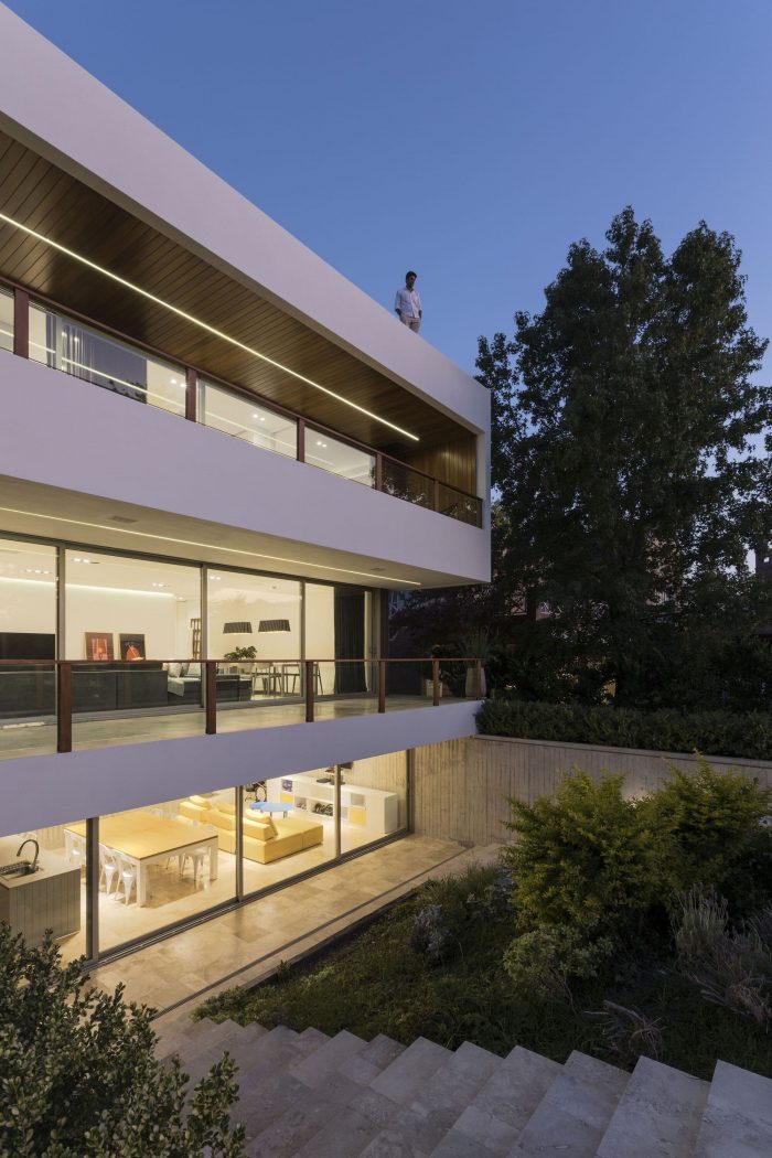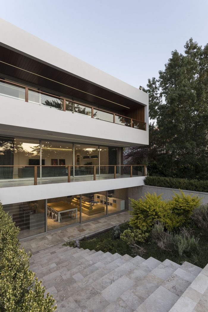 The project features balconies and eaves that provide shade in the summer and frame the best views throughout the year. A travertine marble platform connects the house with the garden, the pool, and the golf course, seeking to integrate architecture into its natural surroundings.