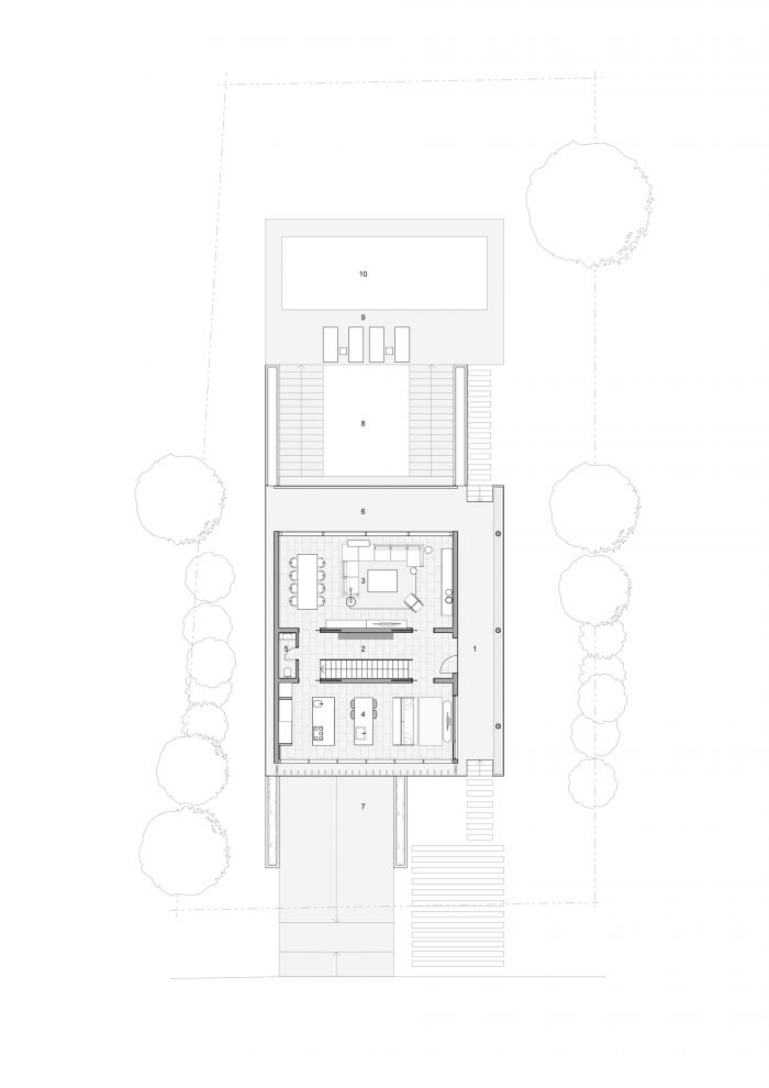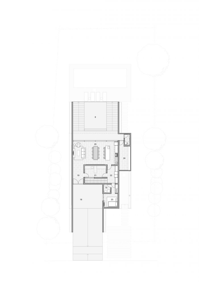 此外,房子有一个独立的地下室烧烤区,它直接与花园相连,并将底层抬高到地形之上,使其拥有更好的视野和丰富的自然光线。