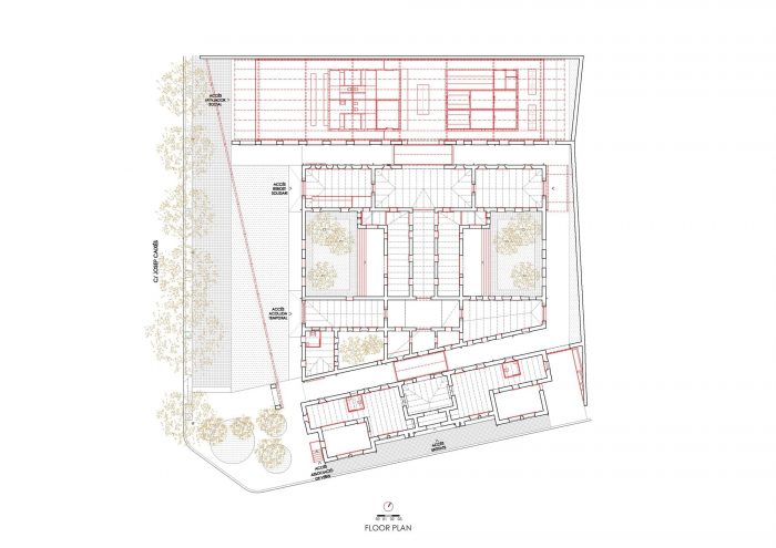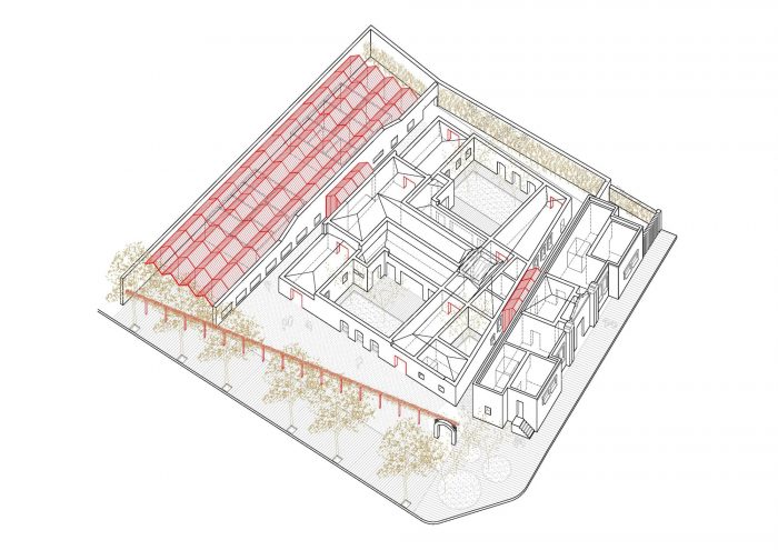 The proposal is the transformation of a transformation. The prison, built in 1929, was transformed into a school in 1979. This earlier intervention is taken as the basis for a project in which the various time strata dialogue with each other in a selection process that shows the concealed construction layers and draws attention to their various transformations. The project respects and recovers the original building, revealing its structure and the construction typology of the time, previously hidden, in order to evoke an image of austerity.