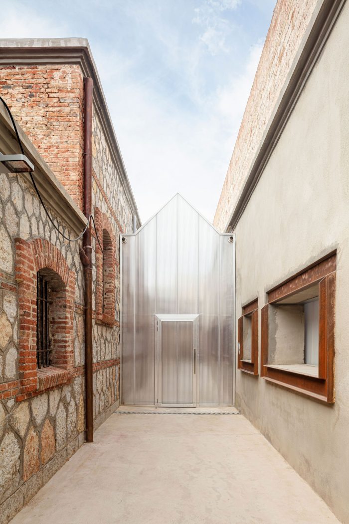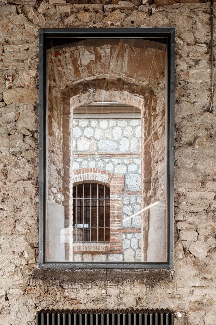 Entrance to the prison used to be from the street via a monumental doorway with minimum pavement space, but this latest proposal eliminates the wall around the yard of the prison building, turning it into a public space, open to the city, that lets passers-by recognize the facility by the continuity of its façades. A slender steel structure is a gesture that recalls the now-absent wall, at the same time threading together three different historical periods. In turn, the conservation of the monumental doorway bears witness to the missing wall and enhances the facility’s heritage value. At a more domestic scale, elements such as windows and wet areas are introduced at a tangent, reinforcing the idea of palimpsest.