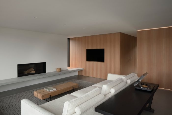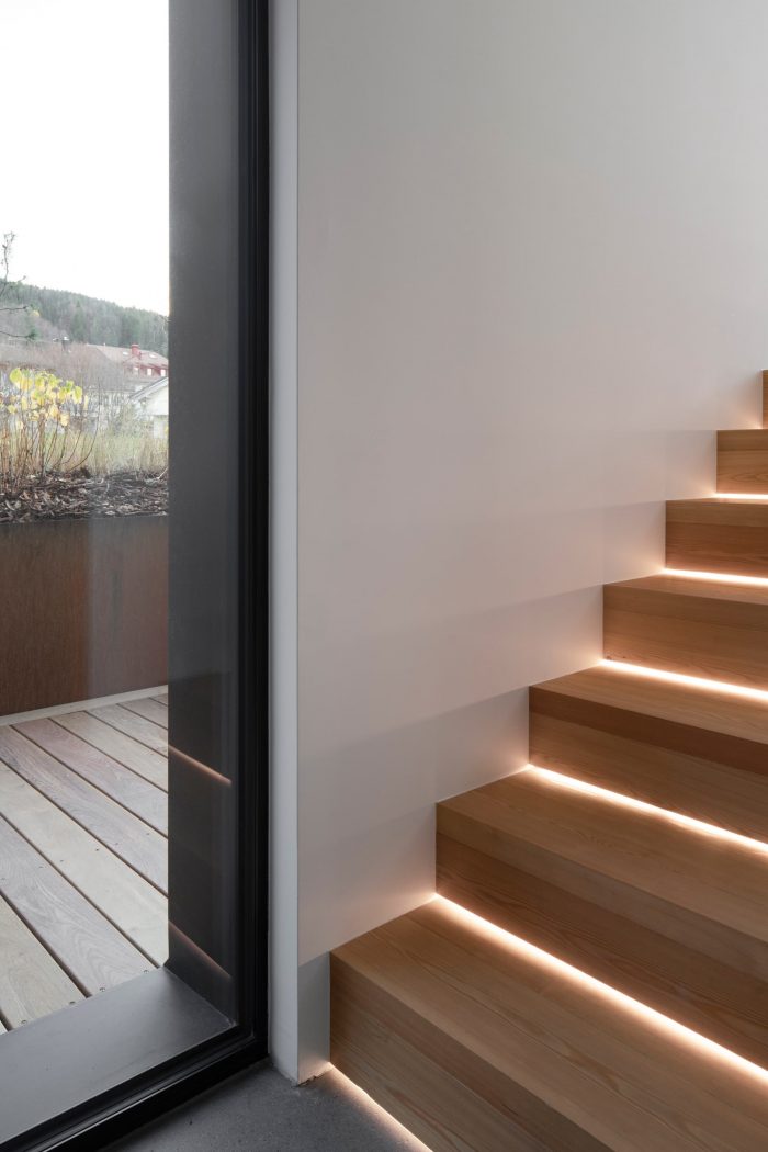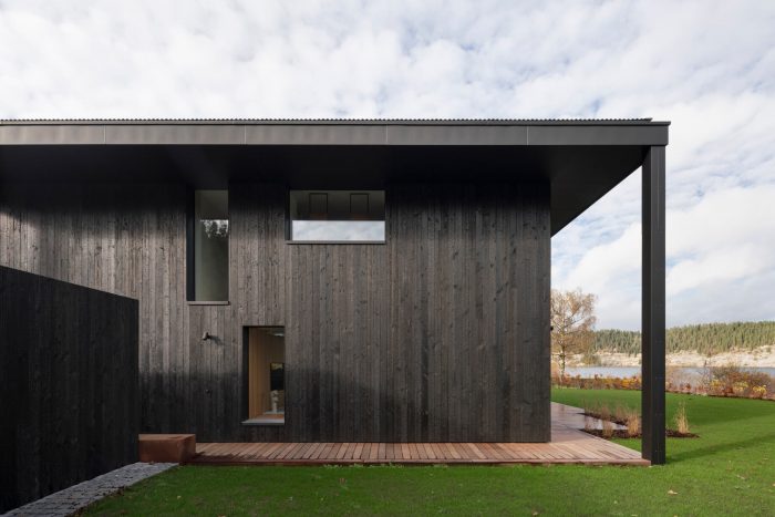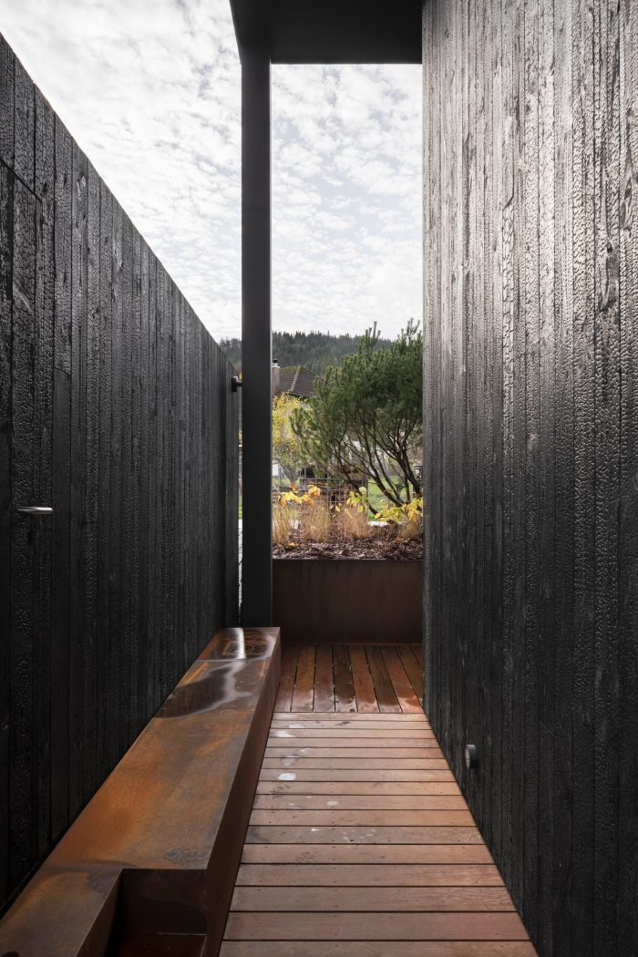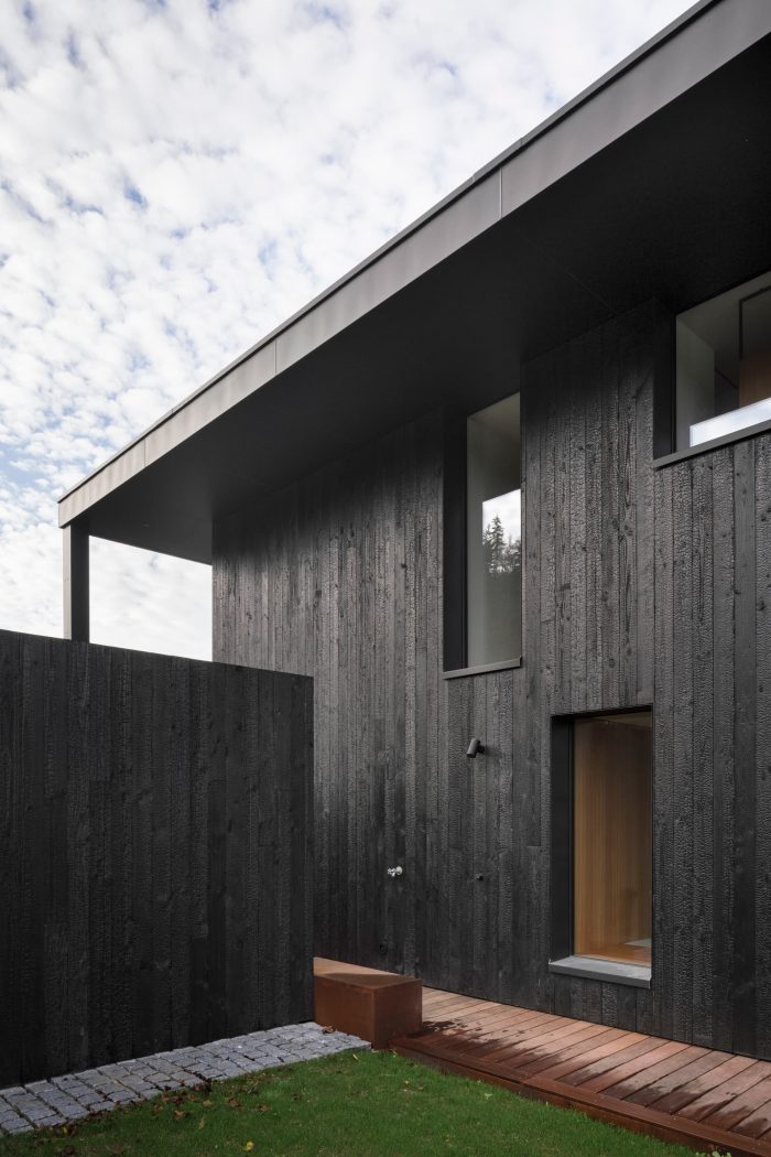 The use of burning wood came about for ecological reasons (no treatment, no painting) and to emphasize the graphic approach of the house while minimizing its visual impact on the landscape. The house is equipped with an ecological geothermal heating system and solar panels integrated into the roof.