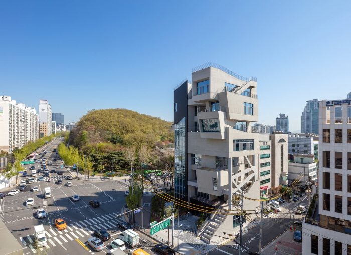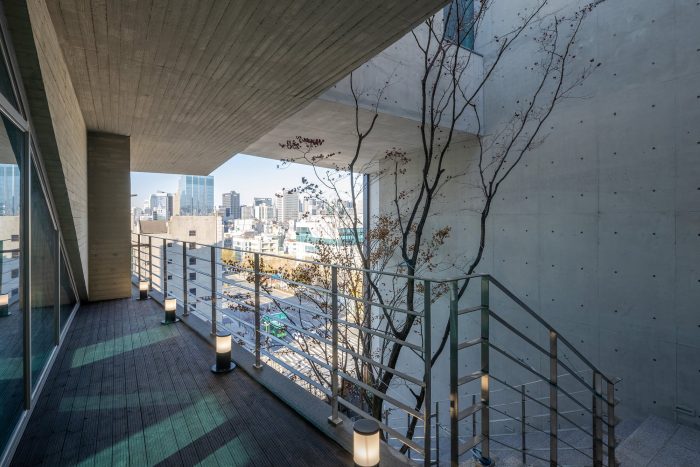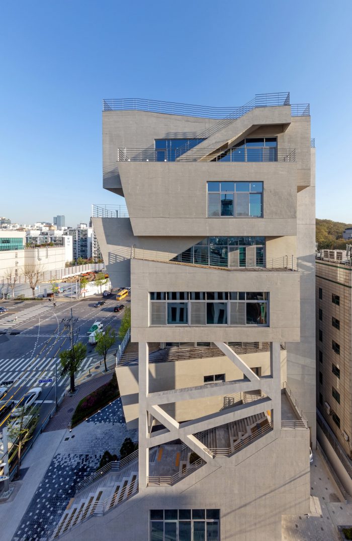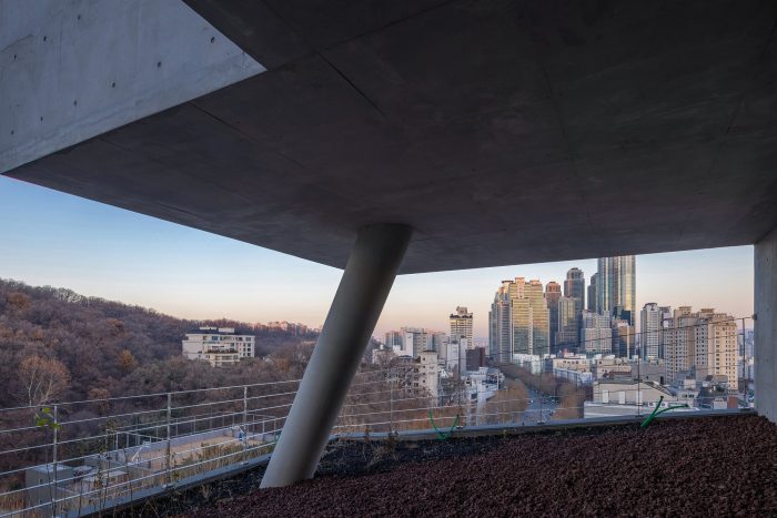 The site of EMK Musical Company is located at the crossroads where Nonhyeonno – one of the major roads in Gangnam, Seoul – and Nambusunhwan-ro intersect with each other. The future benefits, which will accrue from the high rent in Gangnam, especially the high rent on the ground floor, induce conflicts between the program and the desire for the office building space with abundant interior and exterior space (including the exterior space on the ground).