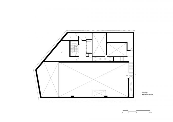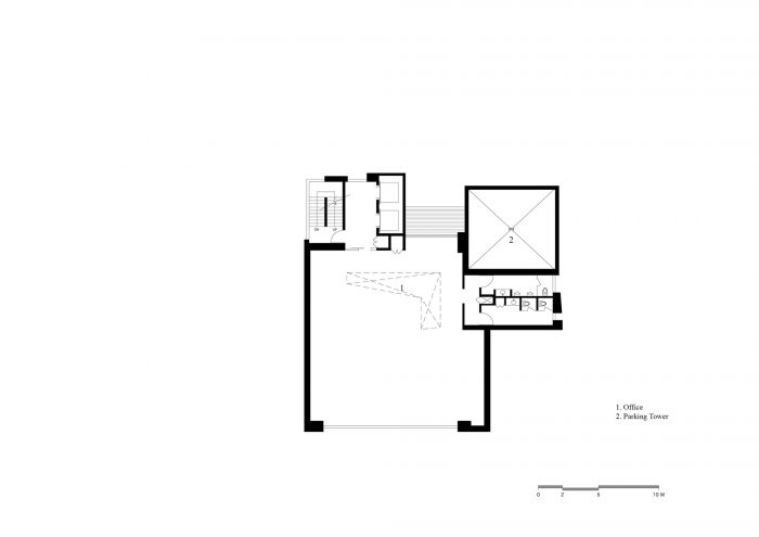 EMK Musical Company suggests a methodology for constructing a small to medium-sized office building those the upper and lower parts of a building are divided and utilized, by allowing the lower floors to be used as rental areas and simultaneously open to the public and the upper floors to be used like another site that has a private external area as a company building, through the ‘strategy of' outside space floating in the air.
