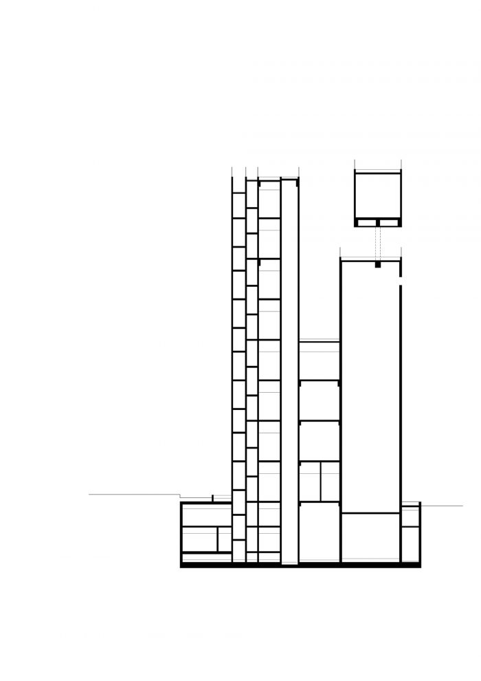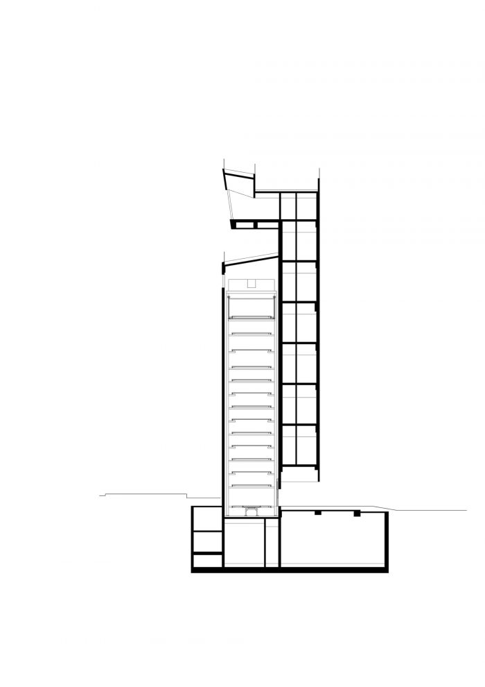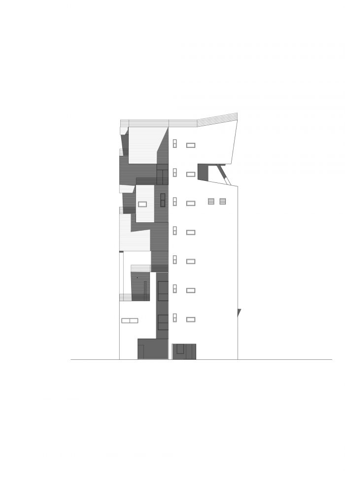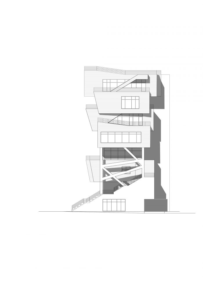 音乐剧的练习室和办公室--在各个项目中体积最大--被安排在地下室和5楼,然后每个体积的上部成为外部空间,每一个都来拥有一个独立的外部空间。特别是1楼的外部空间,由于给办公楼的低层作为租赁空间,不可避免地失去了外部空间,变成了高层的庭院式外部空间,以获得空间的特殊性。连接和支撑这两个项目的柱子结构将成为整个建筑的主结构,成为其余项目可以自由放置的基地。此外,在两个外部空间的上部自由放置租赁和办公区域所创造的外部空间将被各种项目所填充,如露天咖啡馆、露天办公室和室外会议室。