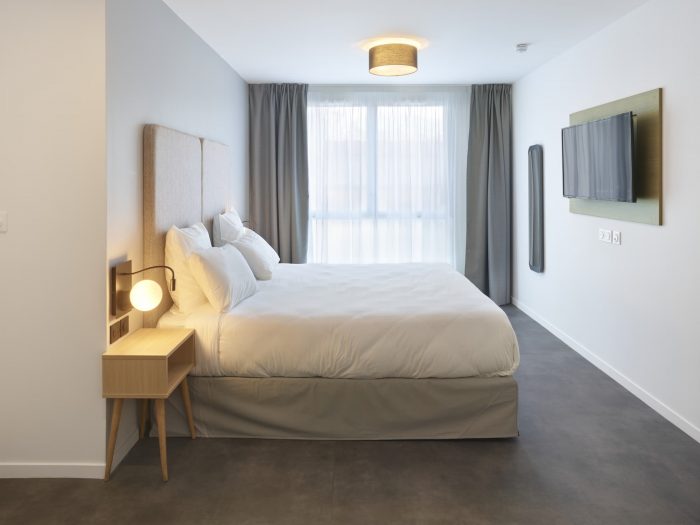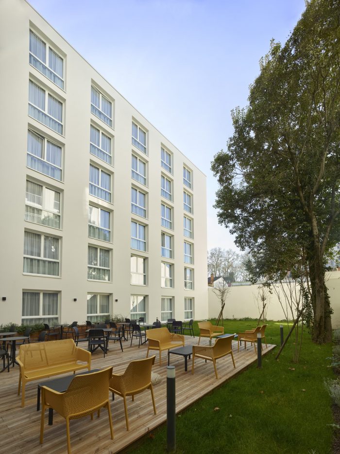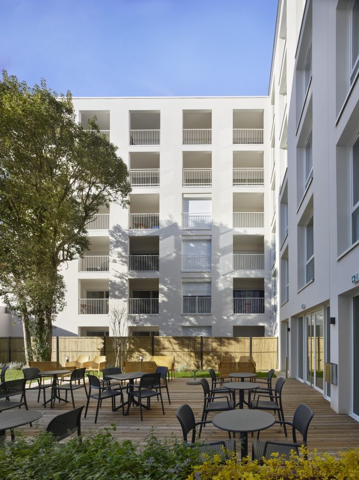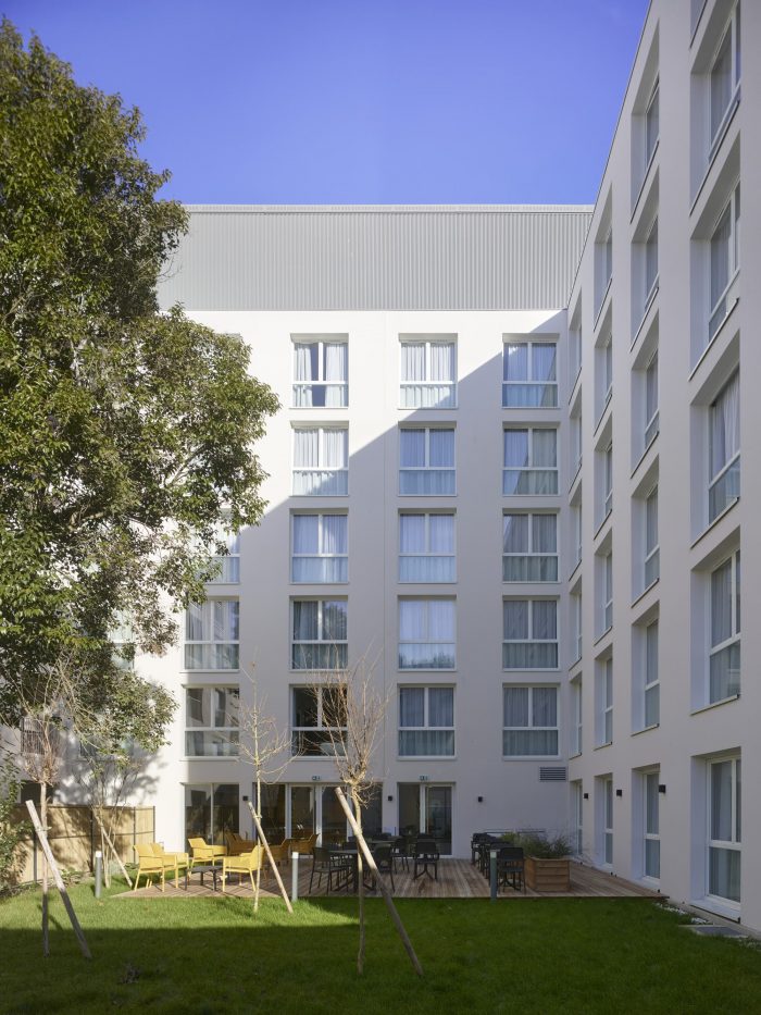 On the ground floor, the common areas of the apartment hotel, as well as the main hall of the housing block, contribute to rejuvenating the rue du Béarnais through large windows allowing views into the landscaped inner courtyard. The balanced and neutral design of the street side façade creates a transition between the existing facades of the street and the new developing neighborhood.