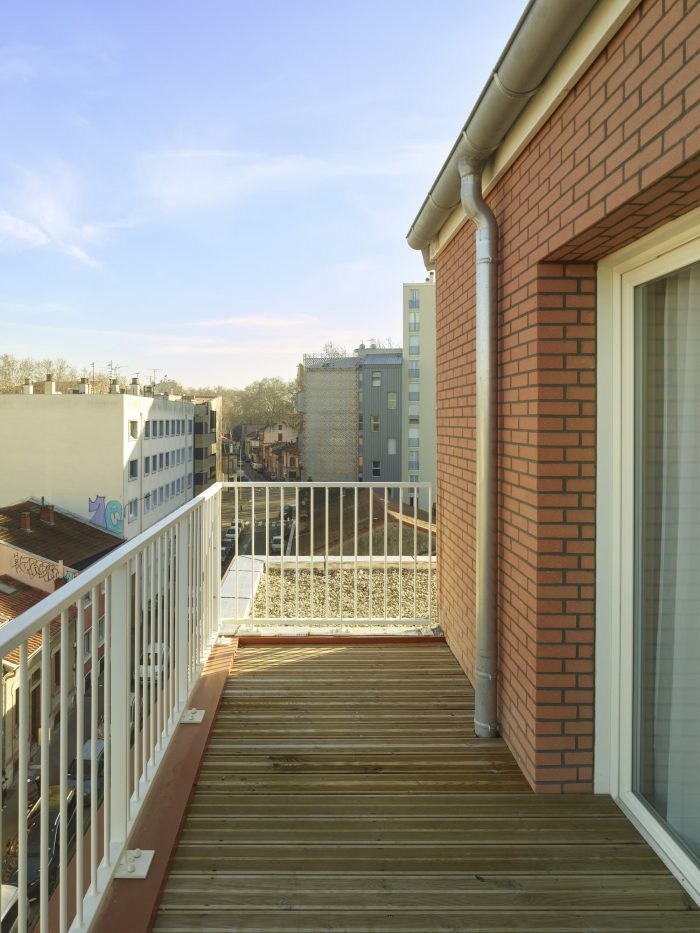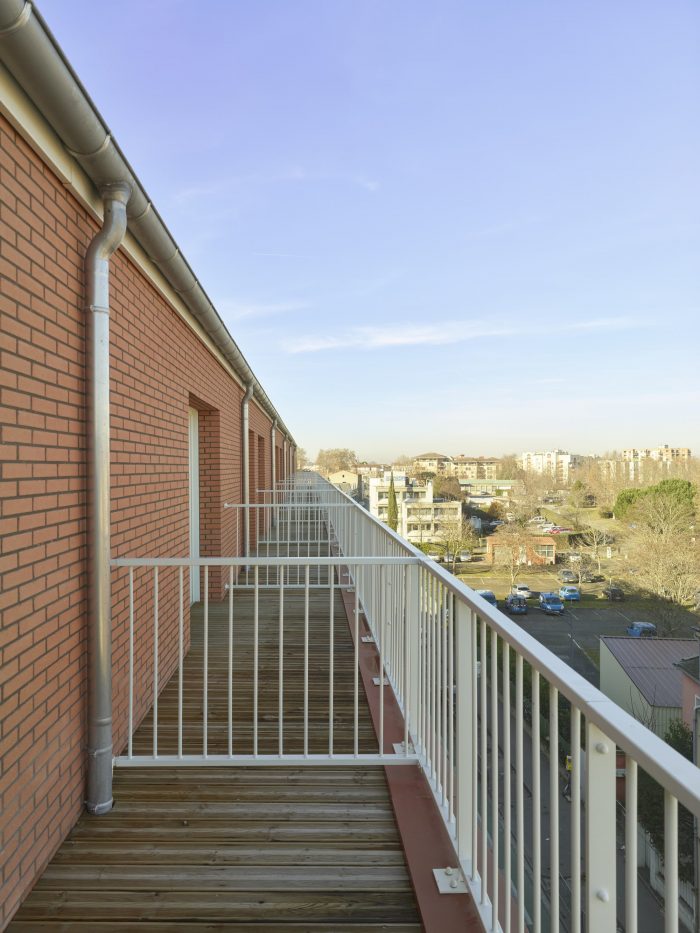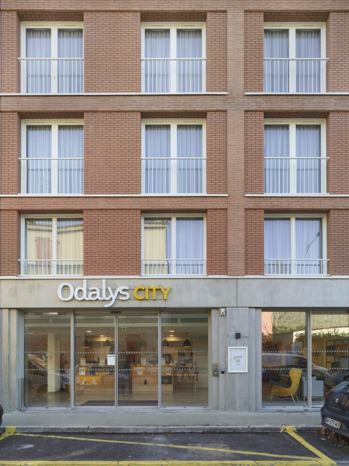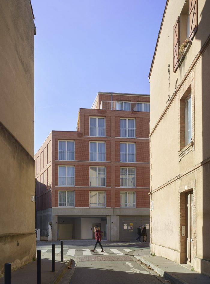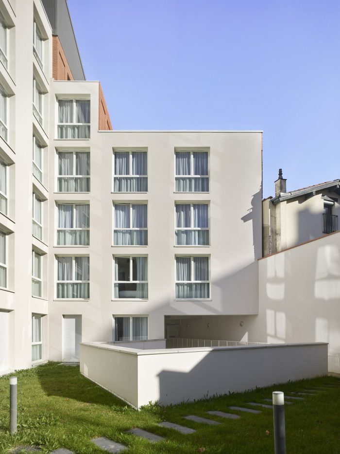 The main building along the street rises to four stories above ground level and completes the urban façade, with a recess at the top level reducing the scale of the building. The façade design is strictly regular, referencing the revenue houses typical of the Haussmannian streets of Toulouse. The continuity of windowsills on the façade creates a rhythm that breaks the repetitiveness of the windows.