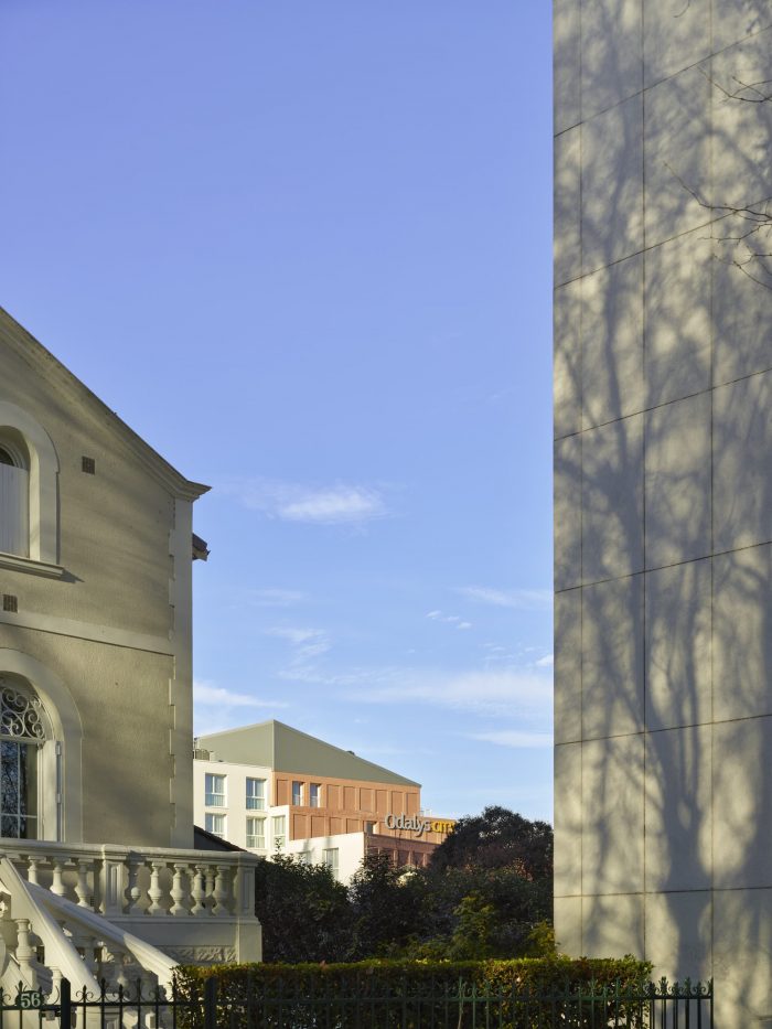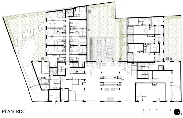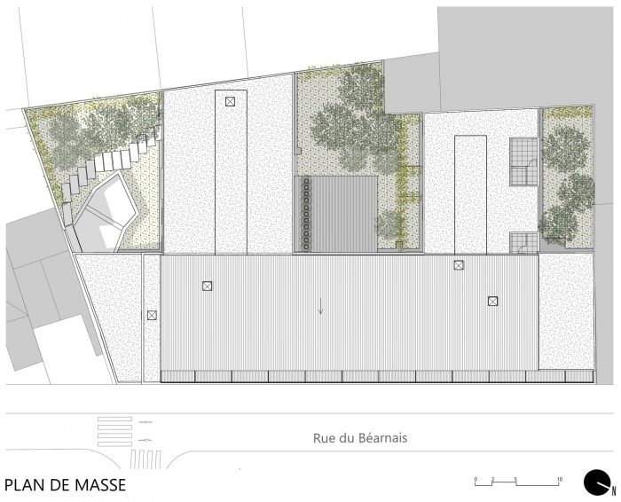 The building layout adopts a comb shape, generating a continuous urban facade on the rue du Béarnais whilst opening up the hotel and housing apartments onto the landscaped garden. These two functional units are fundamentally different in their design, specifically in their use and relationship to the public space. The project, through its material and volume design, seeks however to display a unified and understated image.