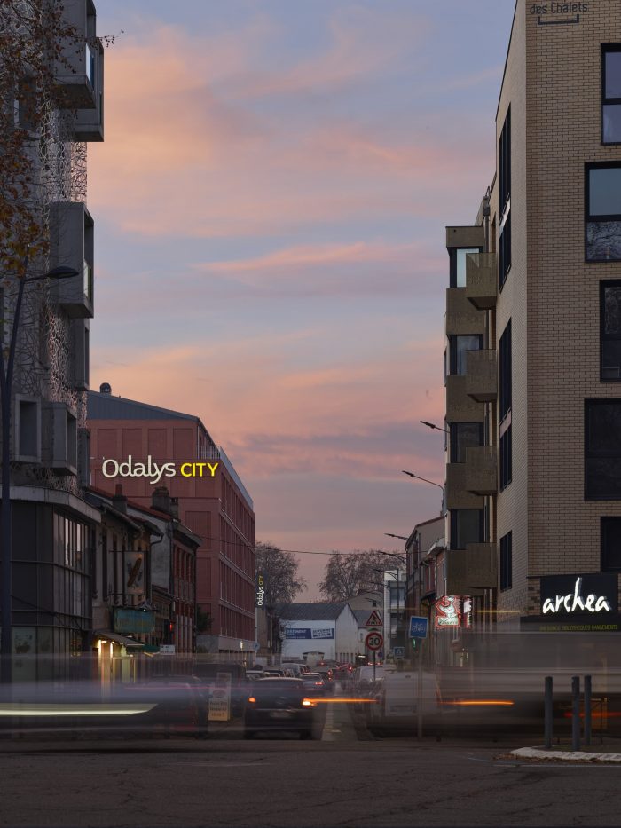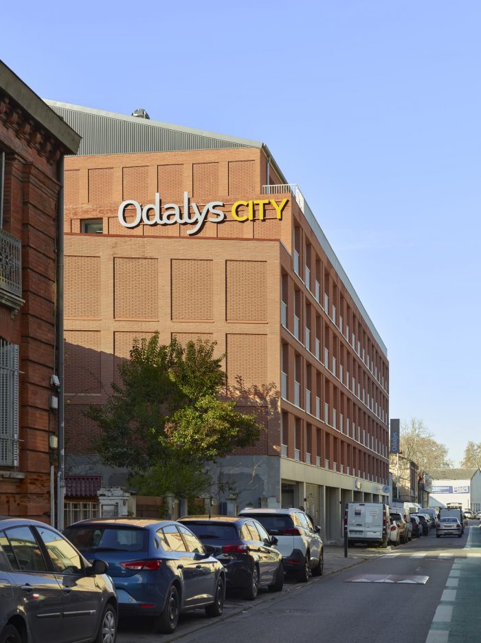 The structure of the building is expressed using pilasters and brick cladding with various bricklaying patterns. The staggered gable ends are also clad in ornamented brick and add to the dynamic design as seen from the entrance of the rue du Béarnais, whilst also creating a backdrop for signage and a focal point in the streetscape. The project thus finds itself firmly anchored in the city of brick that is Toulouse.