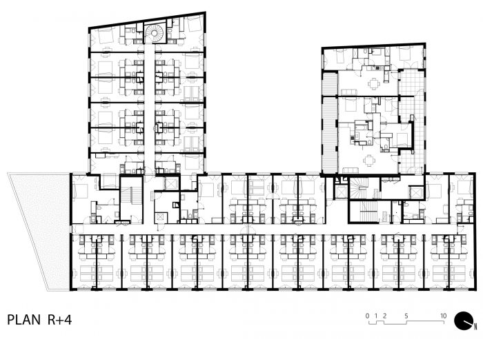建筑布局采用了梳状,在贝亚尼街产生了一个连续的城市外墙,同时将酒店和住房公寓向景观花园开放。这两个功能单元在设计上是根本不同的,特别是在它们的使用和与公共空间的关系上。然而,该项目通过其材料和体量设计,试图展示一个统一的、低调的形象。