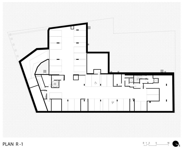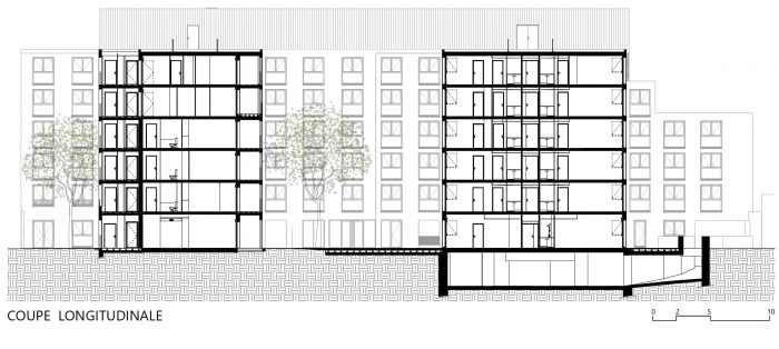The ground floor becomes a transitional space between the public space of the street and the private spaces of the residence and contains the common spaces of the apartment hotel, the main hall of the housing bloc as well as access to the underground car park. The ground floor is therefore largely glazed to easily identify these spaces, but also to rejuvenate and reinvigorate the streetscape by opening the spaces onto the street.