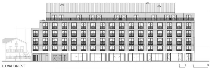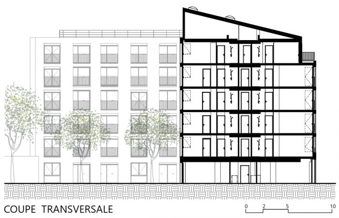 The gable ends of the main building are staggered to articulate the project in the streetscape. The ground floor is voluntarily largely glazed on the common areas whilst the technical spaces are closed off by louvered panels with the same proportions.