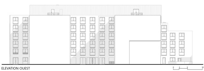 沿街的主楼高出地面四层,完成了城市立面的设计,顶层的凹槽降低了建筑的规模。立面设计是严格规则的,参考了图卢兹Haussmannian街道的典型收入房屋。外墙上窗台的连续性创造了一种节奏,打破了窗户的重复性。