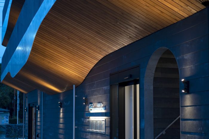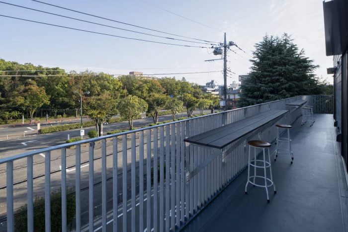 People flow around the building on both weekends and weekdays. While the crowds are smaller than one would find closer to a station, there is reliable community foot traffic. Focusing on this, we created a veranda adjacent to the street and wrapped balconies around the second and third stories. The underside of the balconies form organically shaped, warm wooden eaves that draw people in and define the building’s design.
