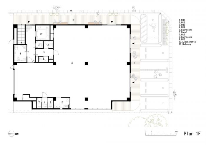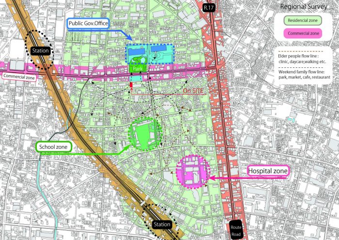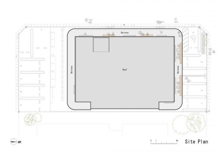 On weekdays, elderly people, homemakers, and children cross the border between the two districts mentioned above for various reasons. The commercial district contains a mix of clinics, osteopath offices, and welfare facilities frequented by the elderly; supermarkets and cafés where homemakers gather; and test-prep centers attended by children. On weekends, families shop at the morning market held in the parking lot of the city hall, spend time at the large park, and eat at cafés or family restaurants before returning to the residential neighborhood. We envisioned the building as a familiar perch for people coming and going between the two areas, with verandas where they can stop and rest.