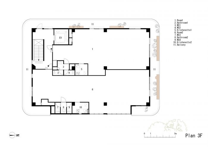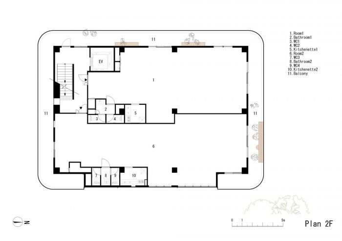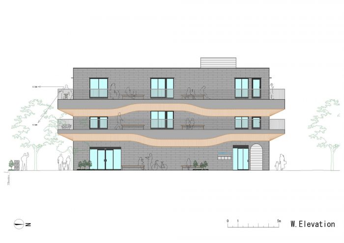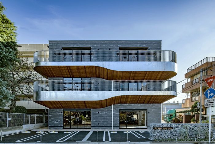 无论周末还是工作日,人们都会在建筑周围流动。虽然人流比靠近车站的地方要少,但有可靠的社区步行交通。关注这一点,我们创造了一个毗邻街道的长廊,并在第二和第三层包裹了阳台。阳台的底部形成了有机的形状,温暖的木制屋檐,吸引了人们的注意力,并确定了建筑的设计。