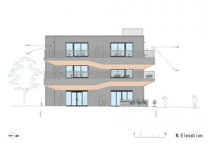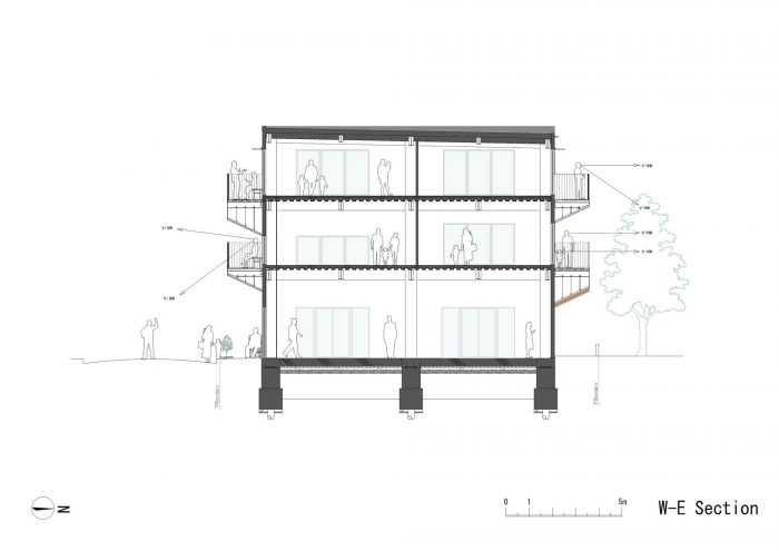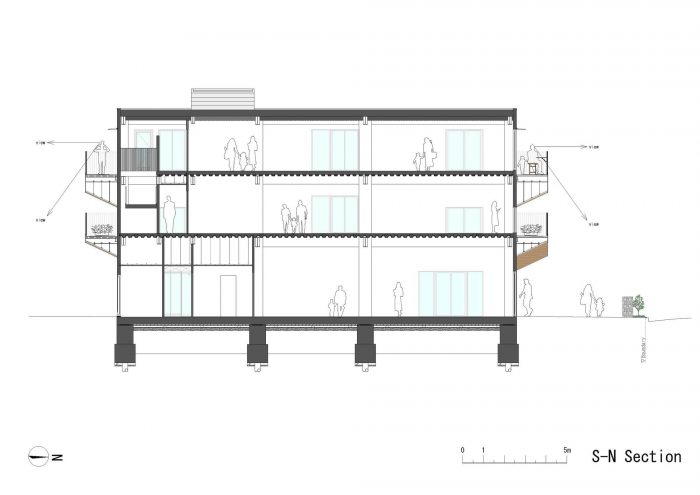 平日里,老人、家庭主妇和儿童因各种原因穿过上述两个区的边界。商业区包含了老年人经常光顾的诊所、骨科医生办公室和福利设施;家庭主妇聚集的超市和咖啡馆;以及儿童参加的考试准备中心。周末,家庭在市政厅停车场举行的早市上购物,在大公园里消磨时间,并在咖啡馆或家庭餐馆用餐,然后再回到住宅区。我们设想该建筑成为人们熟悉的栖息地,来往于这两个区域之间,并有阳台供他们停下来休息。