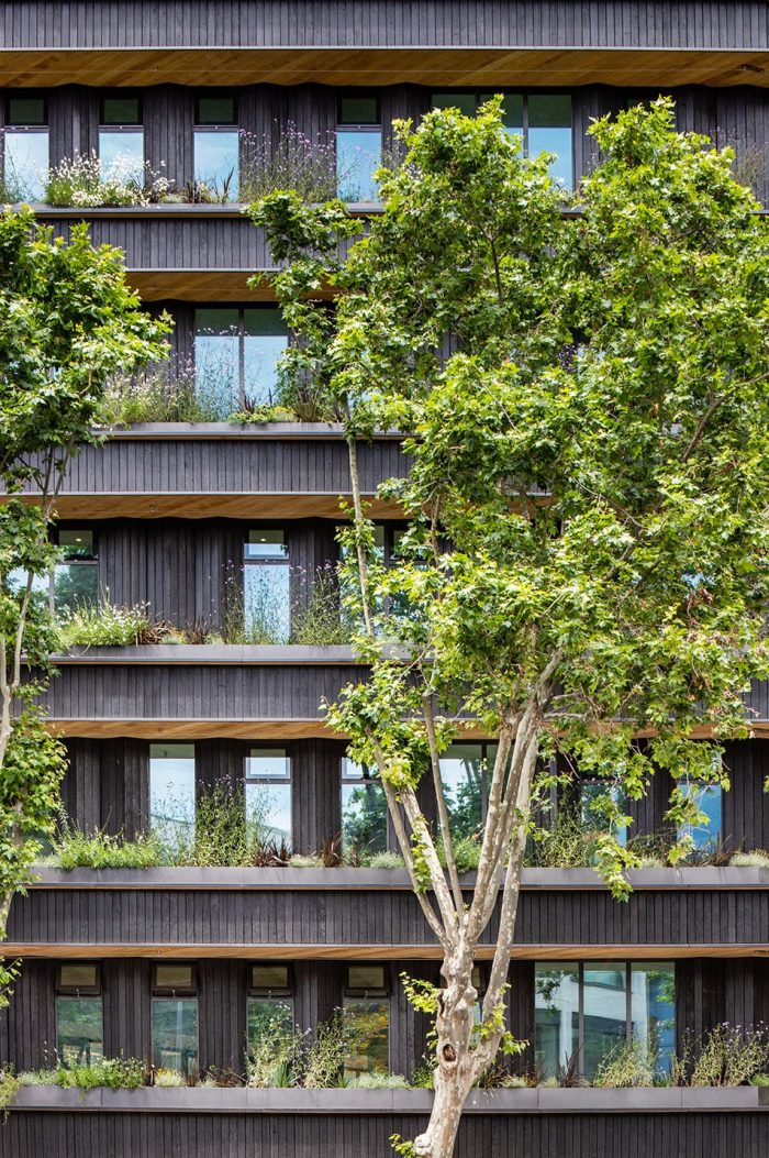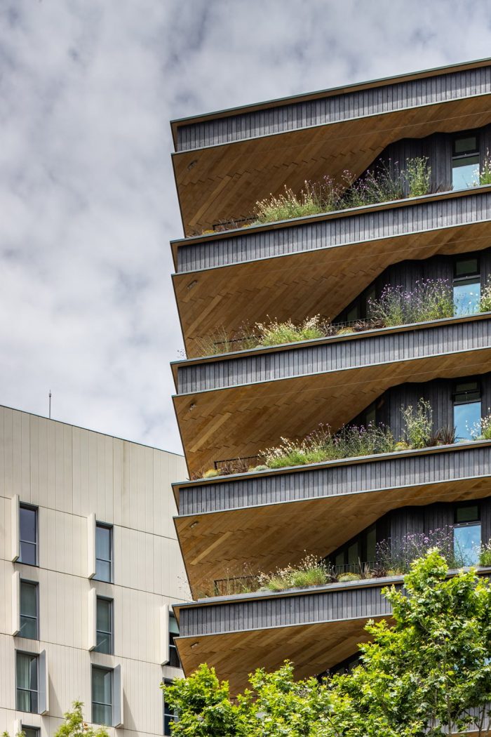由于这种选择,建筑物的外墙被解决了一个高度耐用的自然系统,维护成本非常低。一种古老的技术以一种创新的方式适应了当前严格的要求。在可持续性方面,木材的使用代表了建筑碳足迹的大幅减少,这是团队在每个项目中的承诺。每使用一立方米的木材就会储存大约1吨的二氧化碳。这一事实,加上其他减少建筑能源需求的措施,使该项目获得了LEED金级可持续性认证。