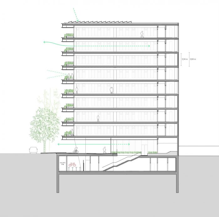 The façade plays with the projections of the floors, providing protection against solar radiation and reducing its energy demand. With the same objective, the optimal percentage between glass and solid in each facade was studied, reaching an optimal balance between the use of natural lighting and the control of solar radiation, that is, between user comfort and energy efficiency.