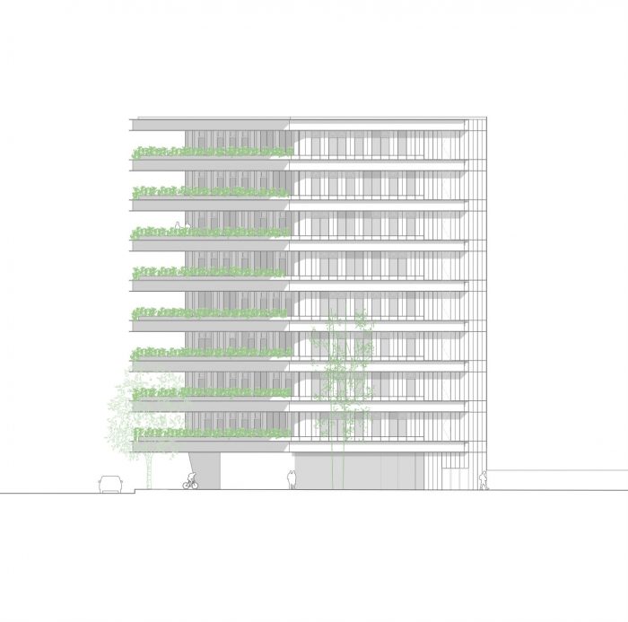 这个立面决定也影响了用户的舒适度,因为它给建筑的外部空间带来了健康和温暖。每层楼的露台安排加强了办公室和室外空间之间的关系,其特点是木材的温暖和植物的存在。