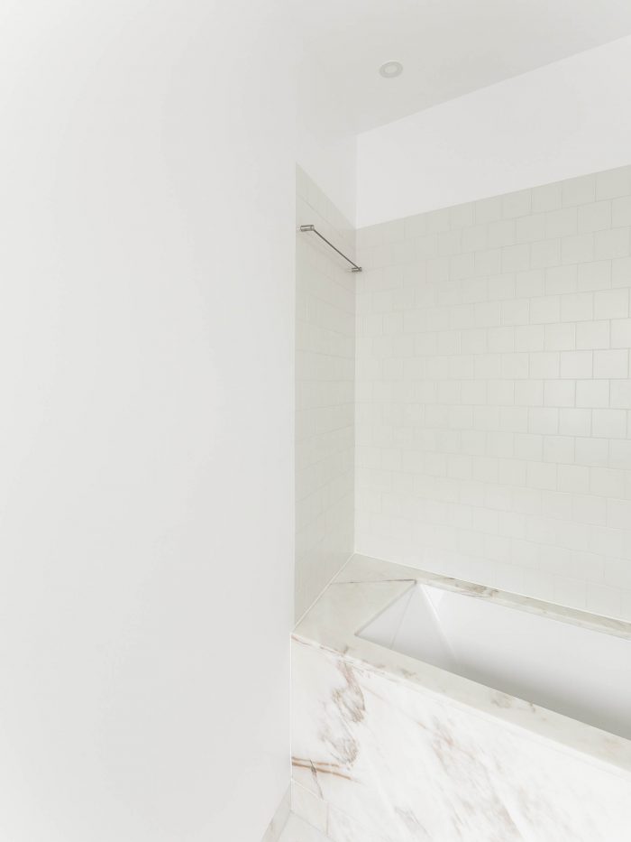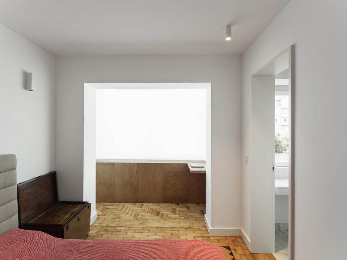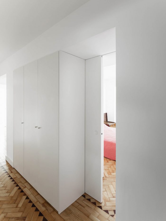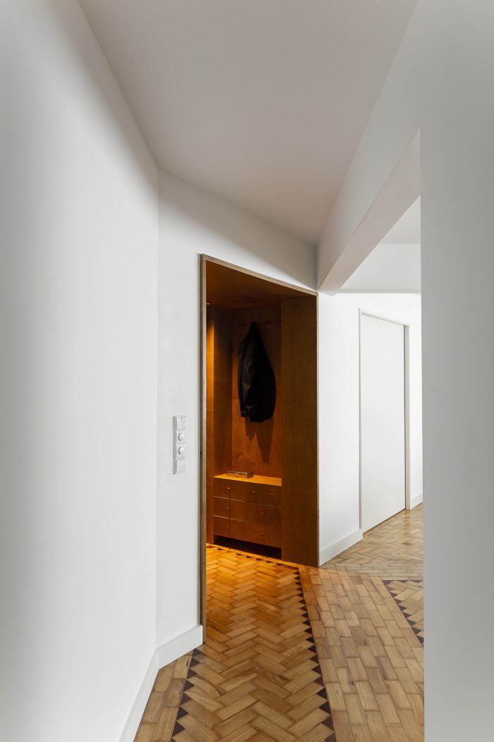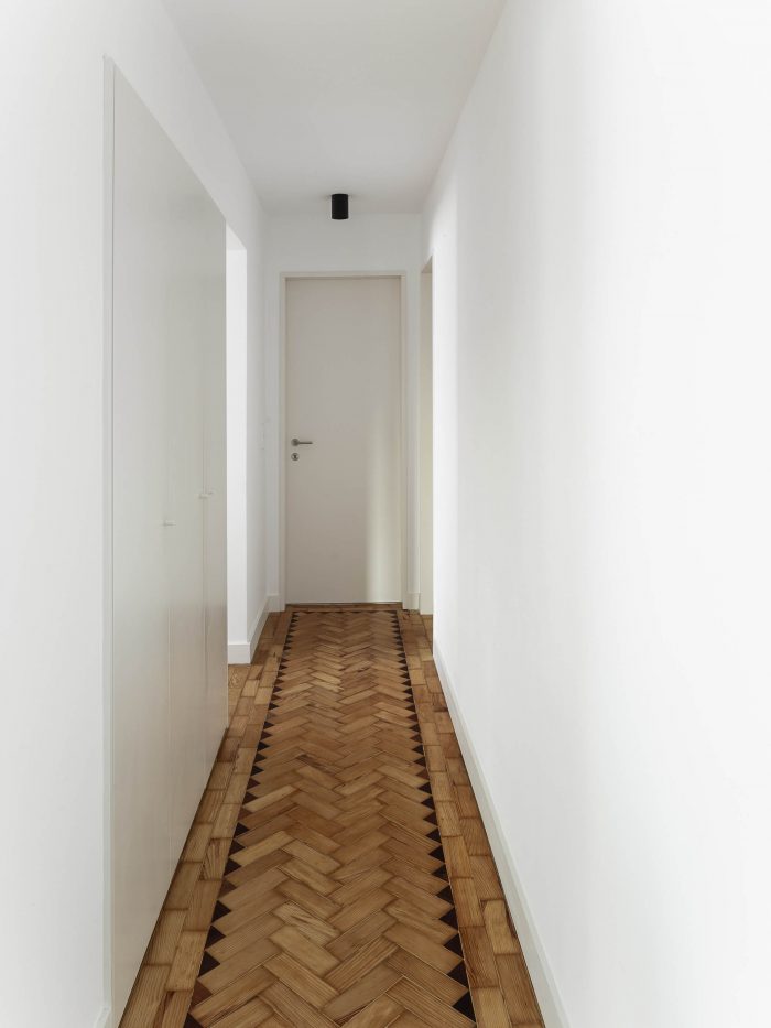 The kitchen and most of the floorings were replaced, with the exception of the wooden parquet flooring, which maintains the apartment's character. A piece of woodwork was added that runs through the entire space from the living room to the bedroom, visually unifying the space.