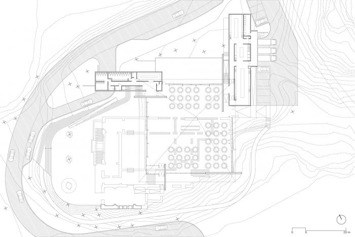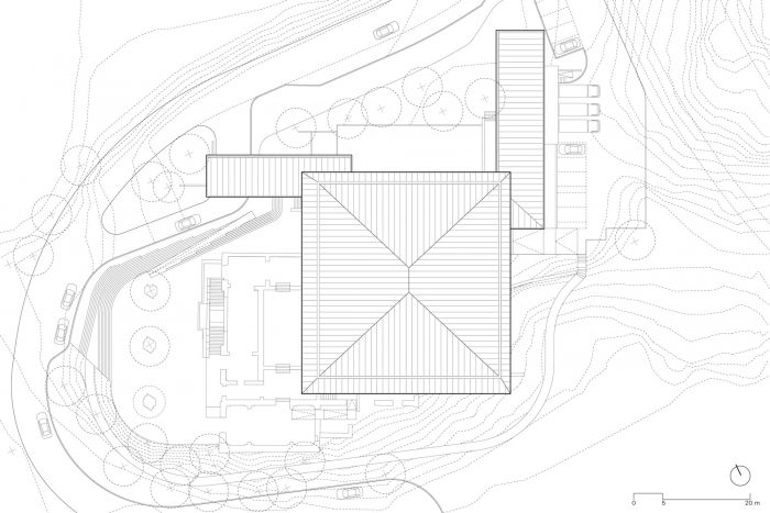 在现有的墙壁和这些程序条之间,提出了四面暴露的钢筋混凝土墙,在结构上分布,以减少地震时的变形。墙体支撑着一个1100平方米的大型悬挂式钢木屋顶,为大型活动厅遮阳和配置。