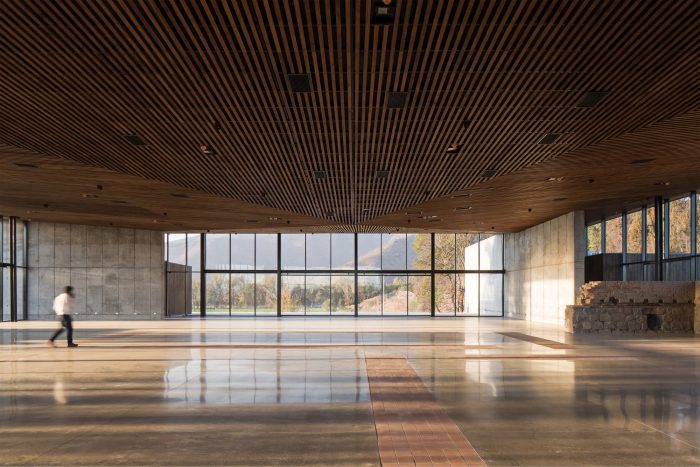With this, a wide space free of pillars is achieved, with five-meter-high glass enclosures around the entire perimeter, visually “opening” the interior spaces towards the pedestrians and adjacent ruins and geographical environments. In addition, these enclosures contain large mobile glass doors, allowing the space to be naturally ventilated, reducing its demand for air conditioning and connecting the hall with the system of patios at different levels of the area of ruins.