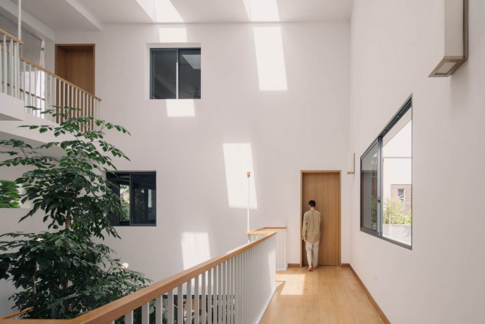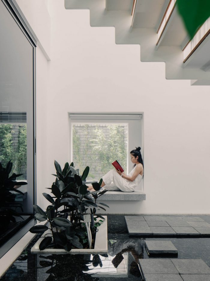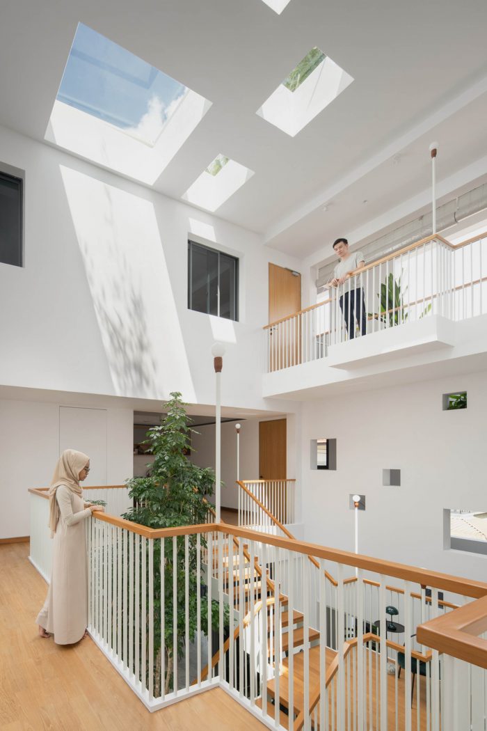 在给每个人提供私人空间的同时,我们用一个中央花园院子来连接所有三层。通往第二层的楼梯和第三层的天桥在这个庭院中纵横交错,使家庭中的人可以偶然相遇。一个水景和高大的室内树木充满了这个庭院,将房子的中心与外部连接起来。
