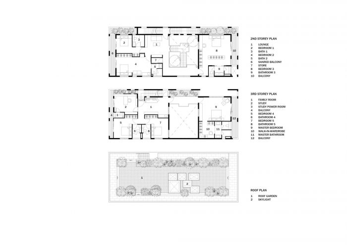 项目简介是为三户人家--客户的年轻家庭带着一个孩子,他们的父母和他们的姑姑--提供一个多代同堂的住宅,有私人空间、公共空间和大量的绿化。我们将该住宅设计成一个景观双层皮,包裹着三层可居住的空间,并由一个垂直的景观庭院穿透。第一层为公共空间,第二层为年长的父母和阿姨,第三层为年轻家庭,有他们自己的私人门和楼梯。屋顶花园是整个建筑的顶端。