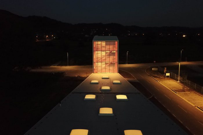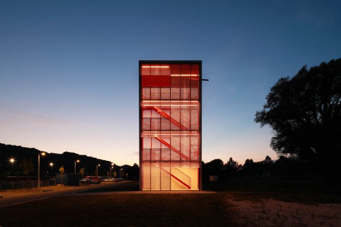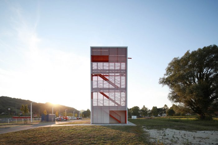 The tower is primarily used for firefighters’ training but is also a landmark, a sign in the landscape. Its steel structure, visible through the metal mesh 'curtain', is clearly showing the utilitarian character of the architecture.