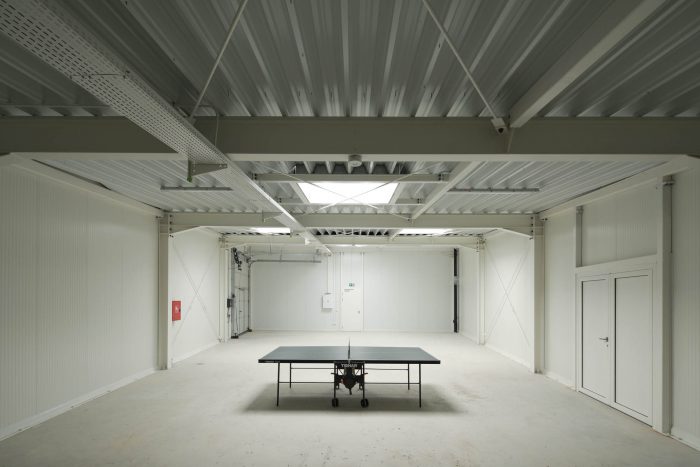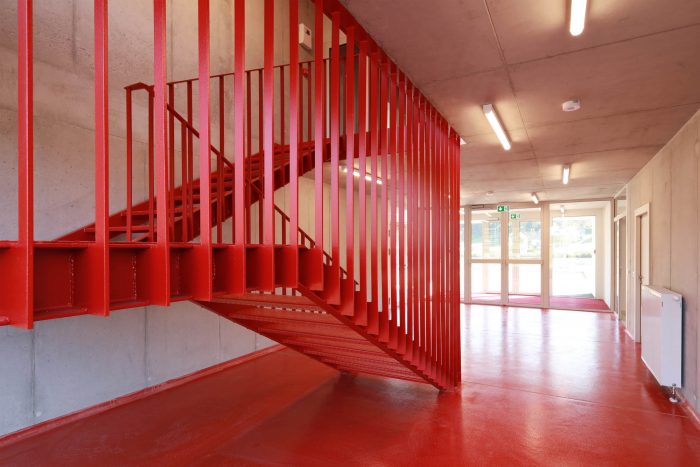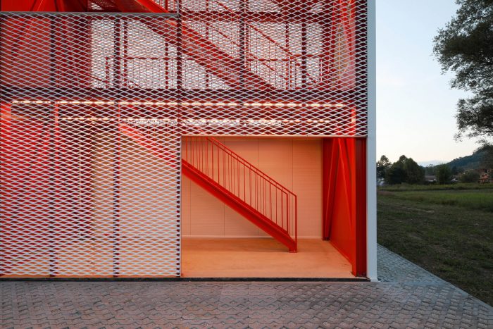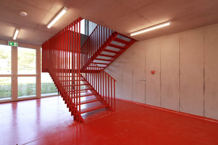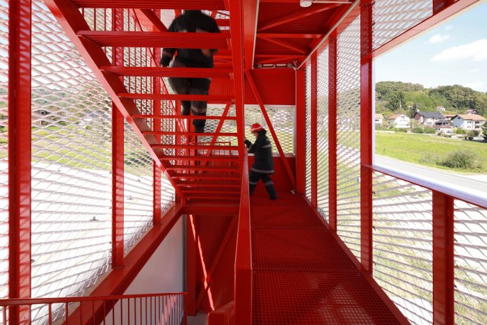 The functions of spaces are clearly distinct by materials - white metal ‘rooms’ contain the vehicles, the work and leisure spaces are finished in raw concrete, and the firefighters’ communication routes are marked by the intense red color surfaces.