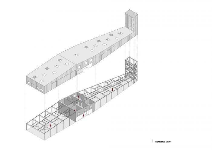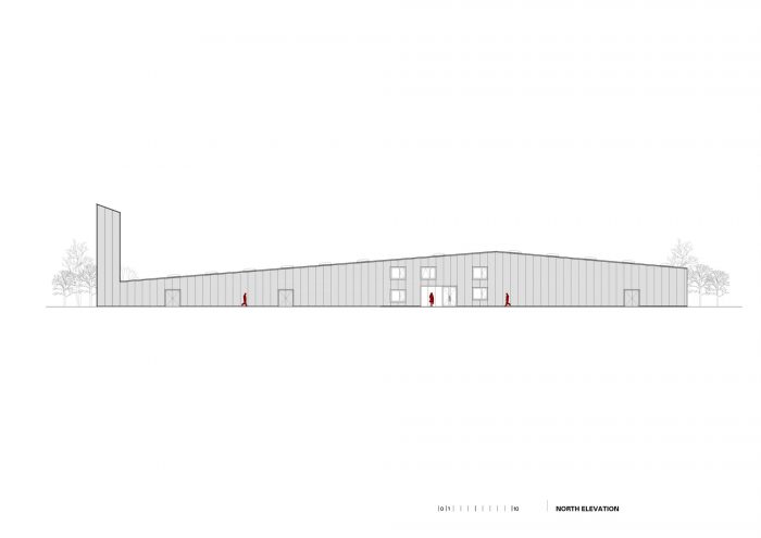 The white metal envelope is made of insulated panels in combination with expanded metal mesh. The envelope is carried by a combined construction - a reinforced concrete core in the middle and a light steel skeleton in the rest of the building.