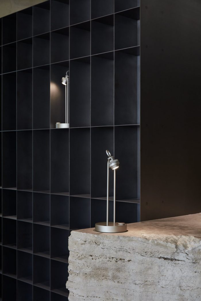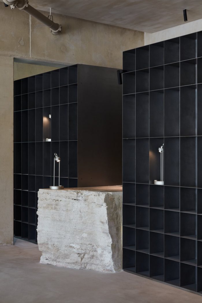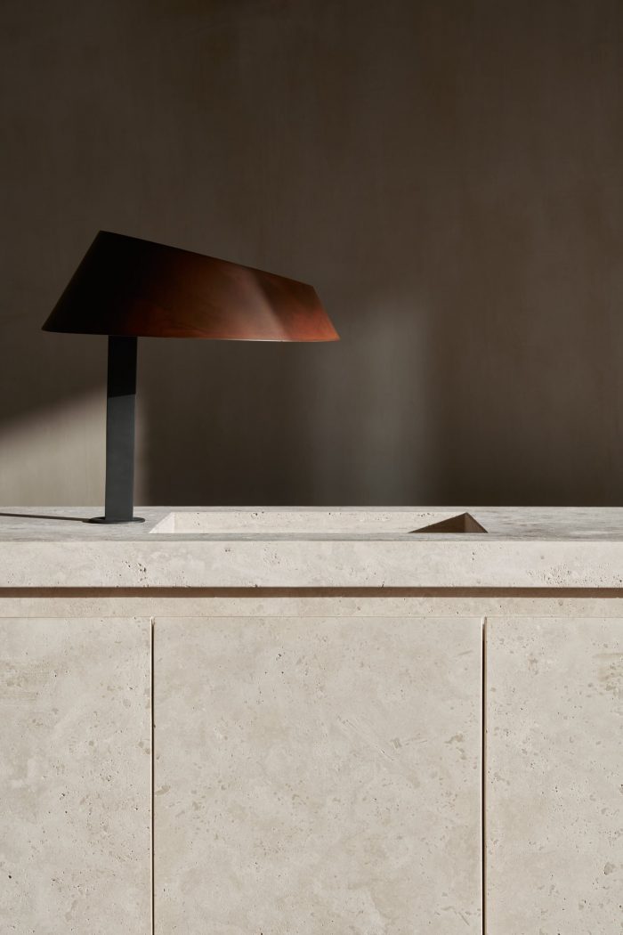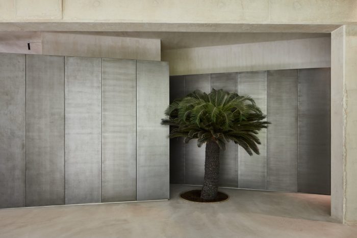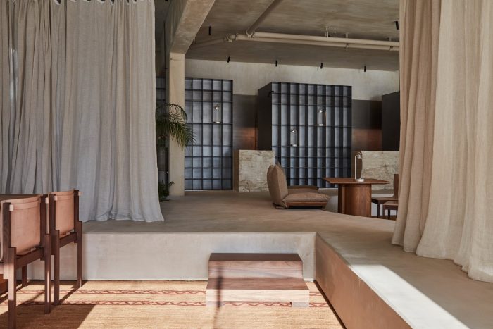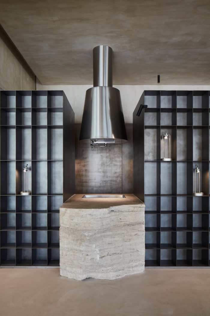 Given the approach to tie the space back to the origins of Emirati culture, the choice of materials celebrates the natural and the raw. The material intervention remained minimal by maintaining the site’s original concrete skeleton in the interior. The raised floor was treated as a thickened slab finished with natural clay from which seating spaces were carved out of. The kitchen volume was made with acid-washed steel and natural cut travertine; further enhancing the raw approach to composing the space. Softer elements such as fabric and plants were utilized to augment the intimacy of the space by creating areas of enclosure. In order to celebrate these elements working together, lighting was carefully curated to orchestrate ephemeral moments that allow the users to experience the subtlety of the design throughout the daytime and evening.