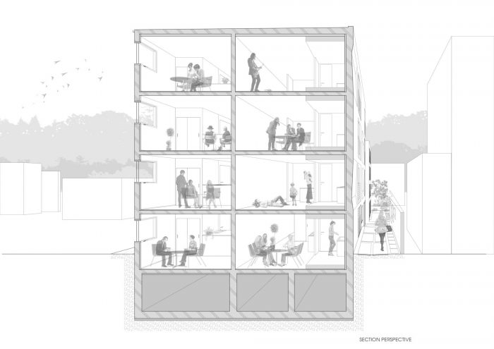 客厅、餐厅和卧室之间的空间关系可以根据每个居民的需求而改变。此外,通过在客厅创造一个部分封闭的空间,我们计划创造一个可以用作步入式衣柜或紧凑型电脑间的空间,我们还在墙上创造了一个方形的开口,以便空间可以扩展。通过对材料和空间的使用,在极简主义的基础上,增加了一种游戏感,我们提出了一种不被东西支配的富裕形式和没有财产的生活。