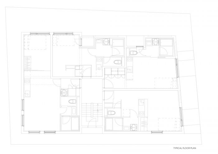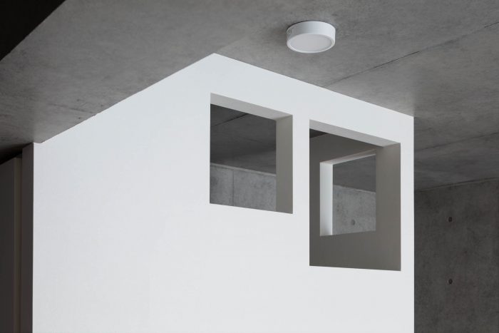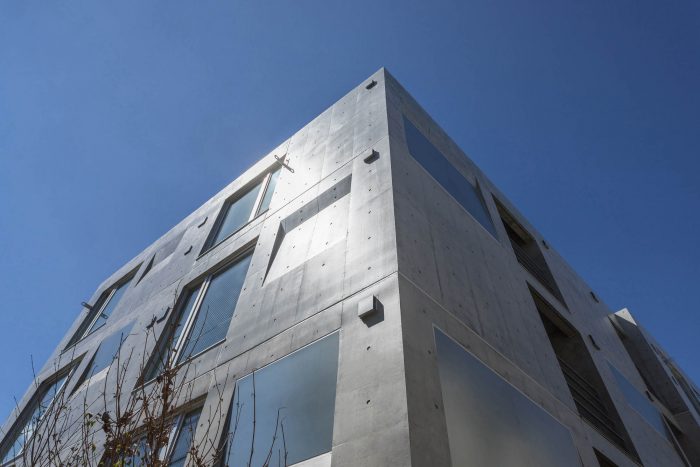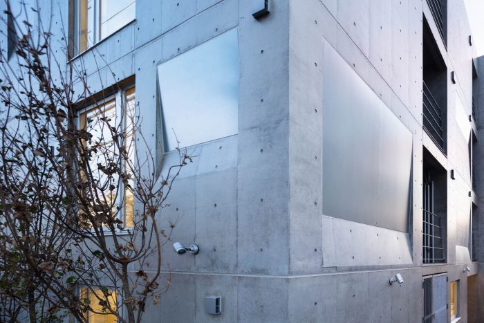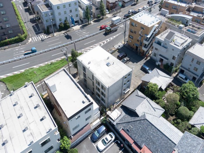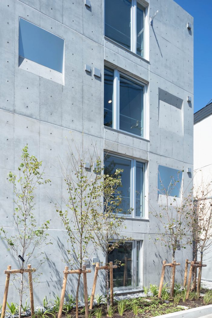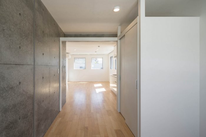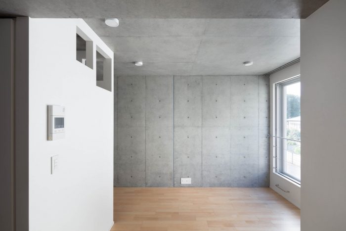 The units range from studio to one-bedroom, and are designed with large, square openings to allow space, light, and wind to enter. The units on the west side have a view of the Todoroki Valley through the openings. The dwelling units combine a simple design with a high degree of freedom in space composition. The white walls and concrete walls are used to express the contrast of materials.