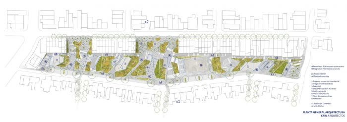 Inside these groves, the project contemplates accessible circulations, small meeting places, and community gardens, which finally unite two neighborhoods that were divided for decades since they were separated by the landfill.